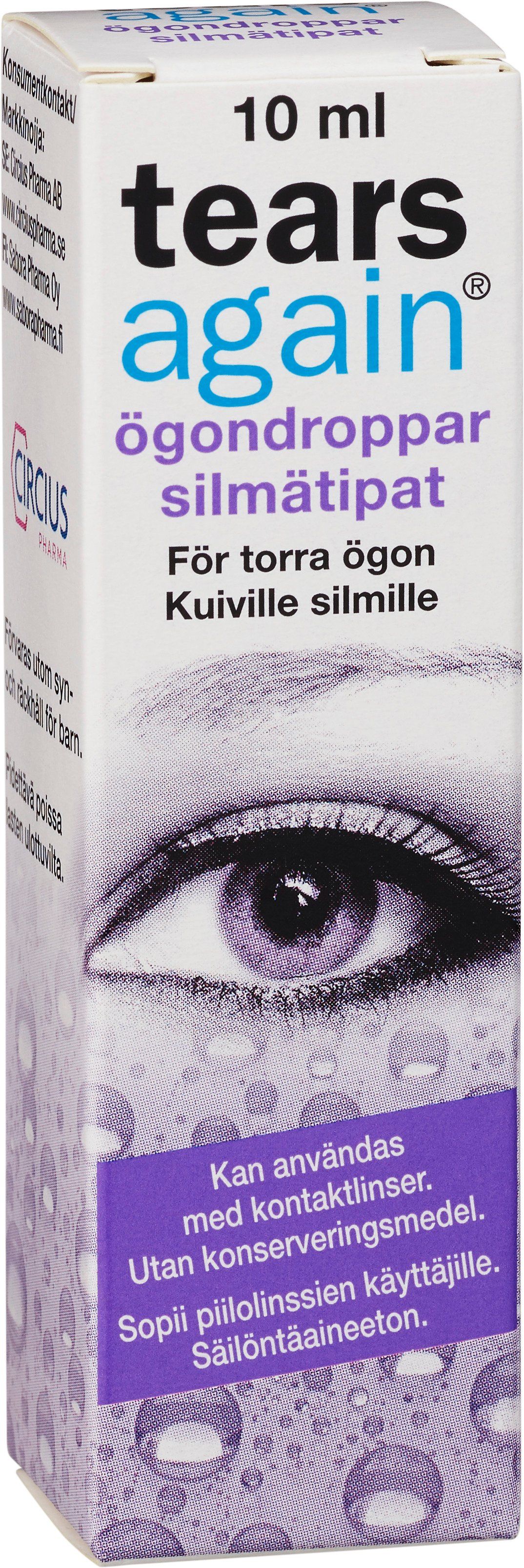 TearsAgain är ögondroppar och spray som lindrar torra ögon. Sprayen stärker ögats lipidskikt och minskar avdunstning, medan ögondropparna med hyaluron återfuktar och ger snabb lindring vid minskad tårproduktion.