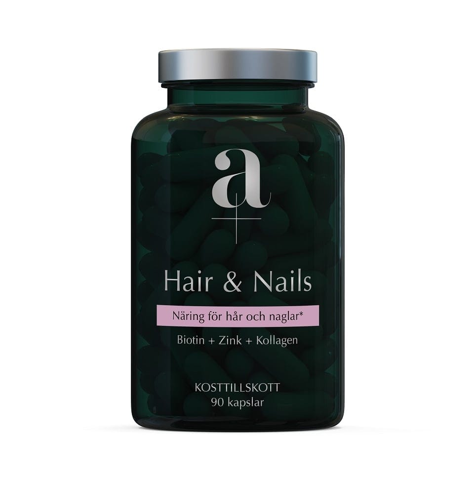 A+ Hair & Nails är utvecklat för dig som vill ge stöd till hår, hud och naglar. Kosttillskottet kombinerar kollagen och MSM – ämnen som naturligt ingår i kroppens vävnader – tillsammans med vitaminer och mineraler som är viktiga för hår- och nagelbildningen. Biotin, zink och selen bidrar till att bibehålla normalt hår, medan zink och selen också bidrar till normala naglar. C-vitamin stödjer normal kollagenbildning, vilket är viktigt för hudens struktur.