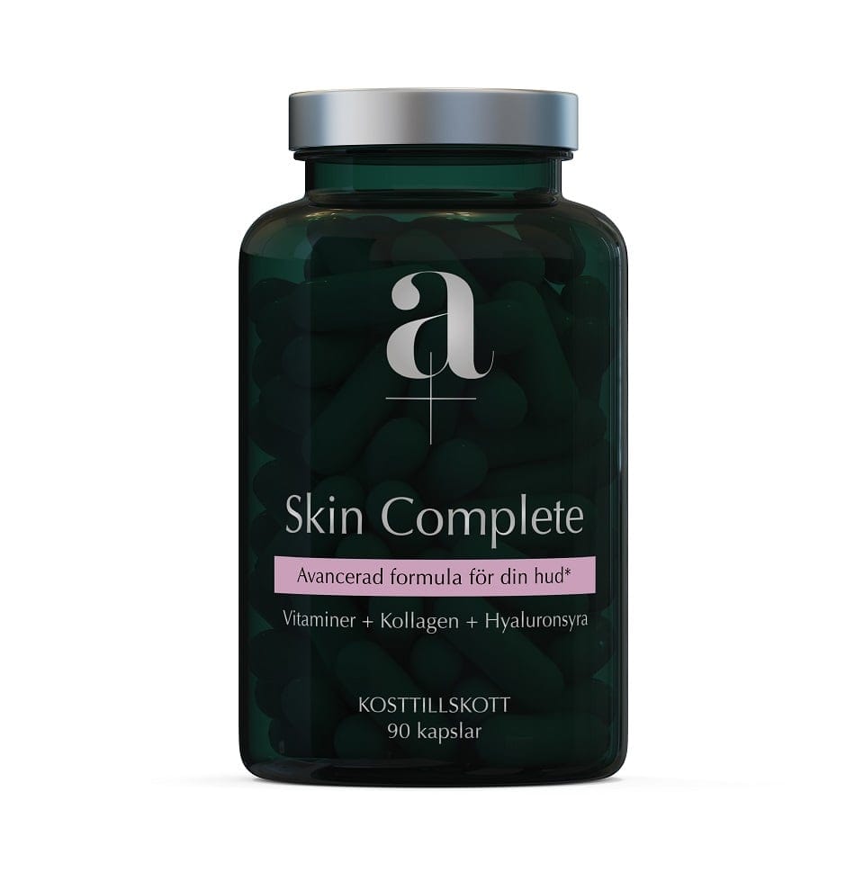 A+ Skin Complete är ett kosttillskott som är utvecklat för hudens normala funktion och struktur. Produkten innehåller hydrolyserat kollagen typ I från fisk – samma typ som naturligt finns i hud, hår och naglar. Formulan är berikad med hyaluronsyra, ett ämne som förekommer i huden och kan binda stora mängder vatten för att bevara fukt.