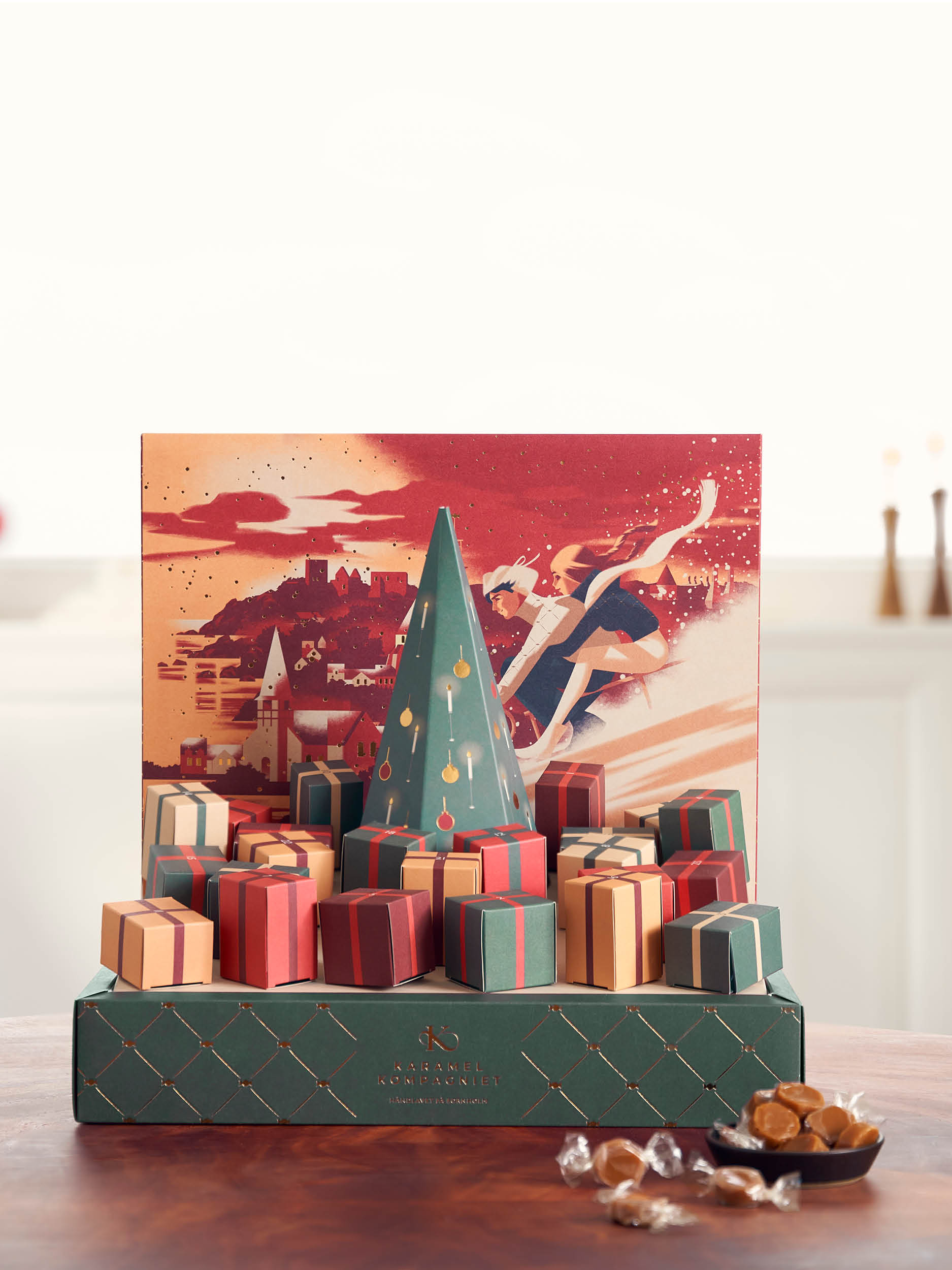 En riktig juldekoration som innehåller 2 st kolakulor i 23 dagar och 2 st chokladdoppade kolabars till den 24:e. Fylld med Bornholmska karameller.
