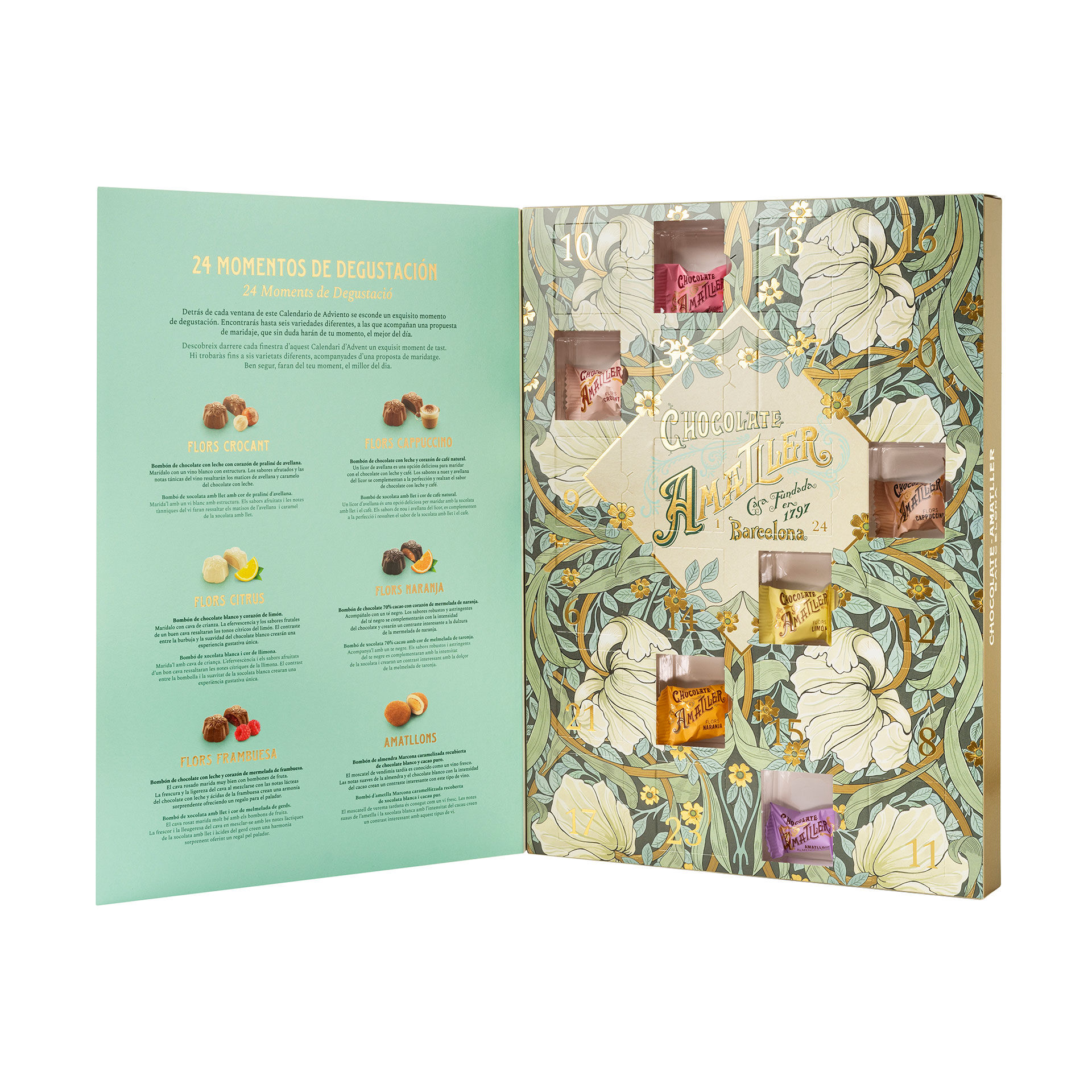 Bakom varje fönster i denna Amatller Chokladadventskalender döljer sig ett utsökt ögonblick av provsmakning. Du hittar upp till sex olika varianter som följer med ett parningsförslag, vilket utan tvekan kommer att göra ditt ögonblick till det bästa för dagen.