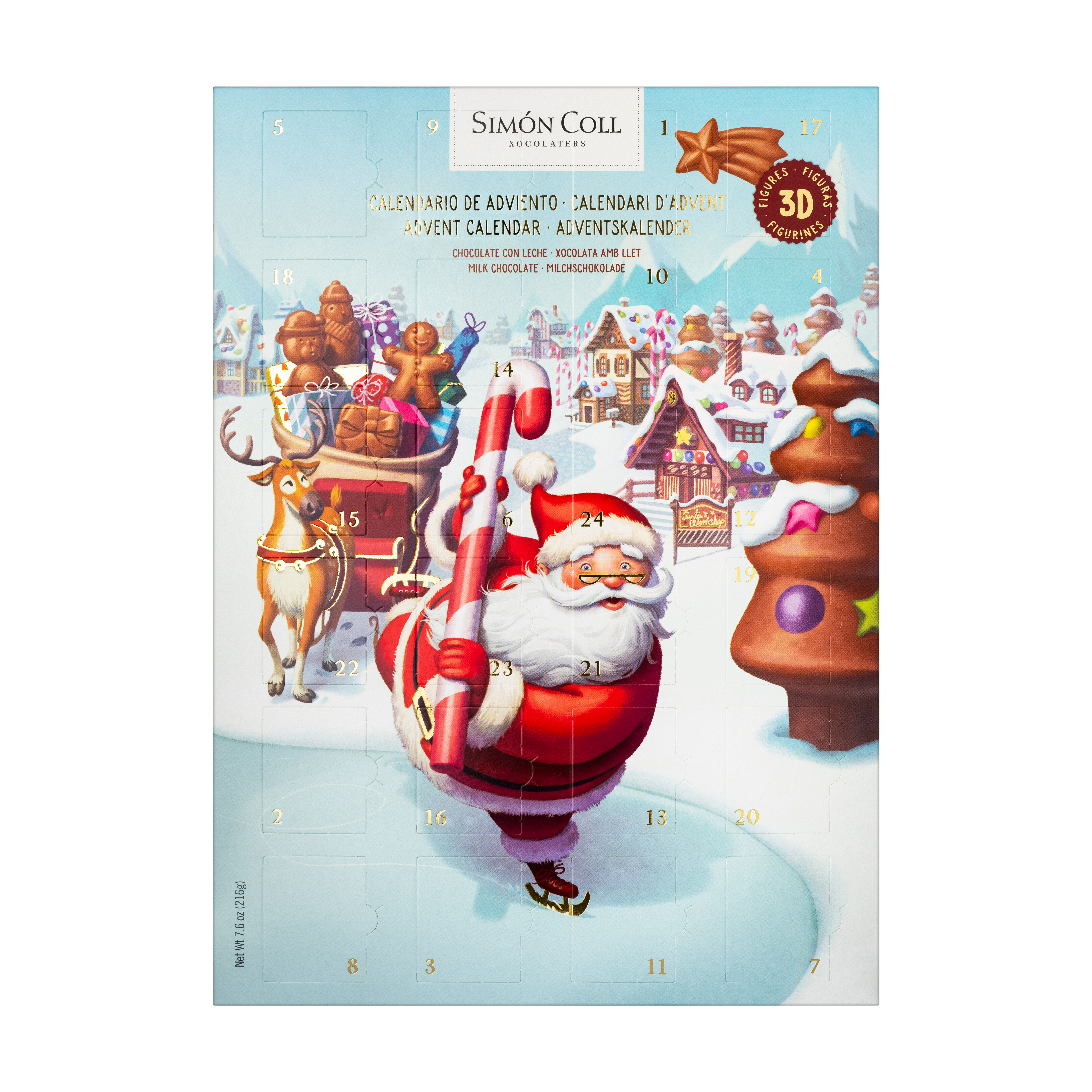 Adventskalender 24 luckor med jul- och vinterfigurer i 3D av ljus choklad.
