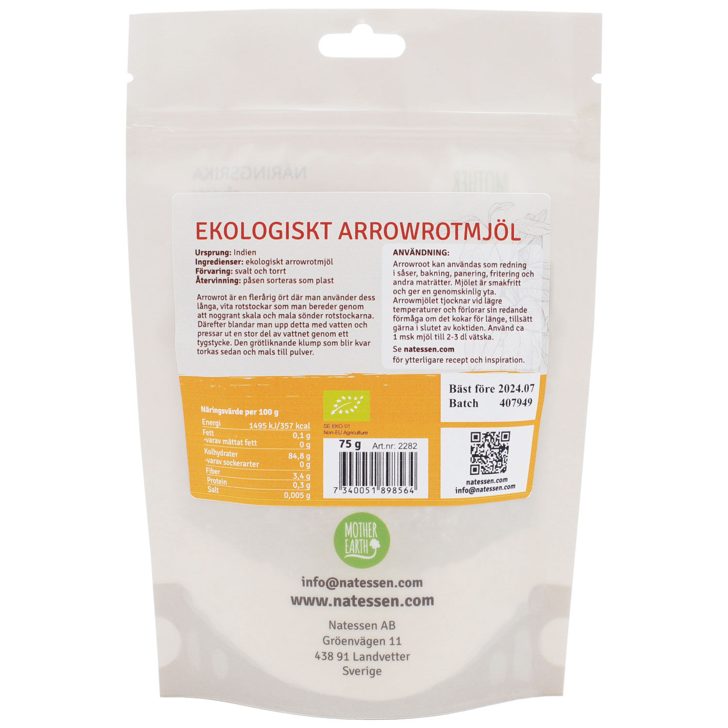 Ingredienser: 100% ekologiskt mjöl av arrowrot