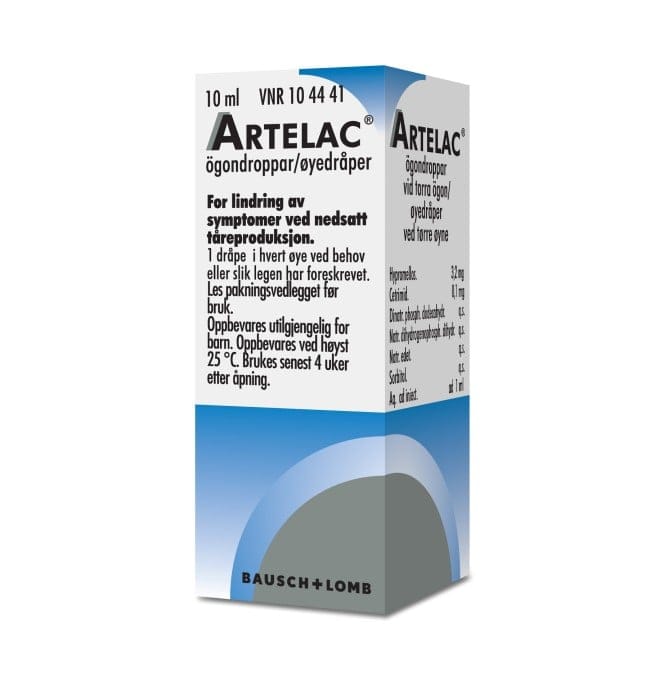 Artelac ögondroppar lindrar symtomen vid torra ögon. Tårersättningsmedlet liknar den naturliga tårvätskan och verkar genom att både skydda, smörja och återfukta ögat. Rekommenderad dos är en droppe i varje öga. Du kan ta dem vid behov. Använder du kontaktlinser ska du ta ut dem innan du använder Artelac ögondroppar i flaska. Vänta i minst 15 minuter innan du sätter tillbaka dem i ögonen igen. Orsakerna till torra ögon kan variera. Det kan till exempel bero på inomhusmiljö och torr luft men även bakomliggande sjukdomar eller läkemedel. Artelac ögondroppar på flaska innehåller konserveringsmedlet cetrimid. Artelac finns även i engångsförpackningar/pipetter, dessa är fria från konserveringsmedel. Öppnad flaska skall användas inom 4 veckor.