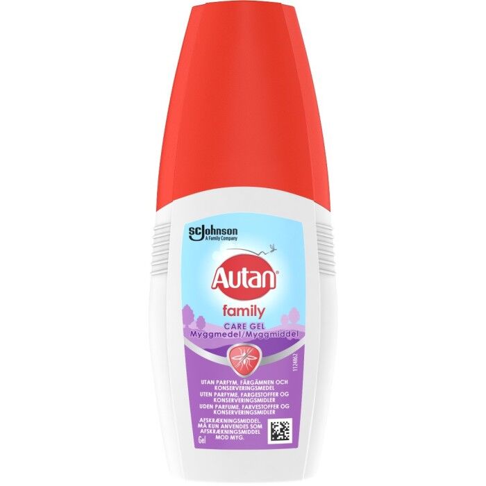 Autan Family Care Gel myggmedel skyddar hela familjen mot mygg. Autan Family Care är ett insektsmedel som skyddar mot myggbett i upp till 4 timmar och kan användas på vuxna och barn över 3 år. Fri från parfym, färgämnen och konserveringsmedel.