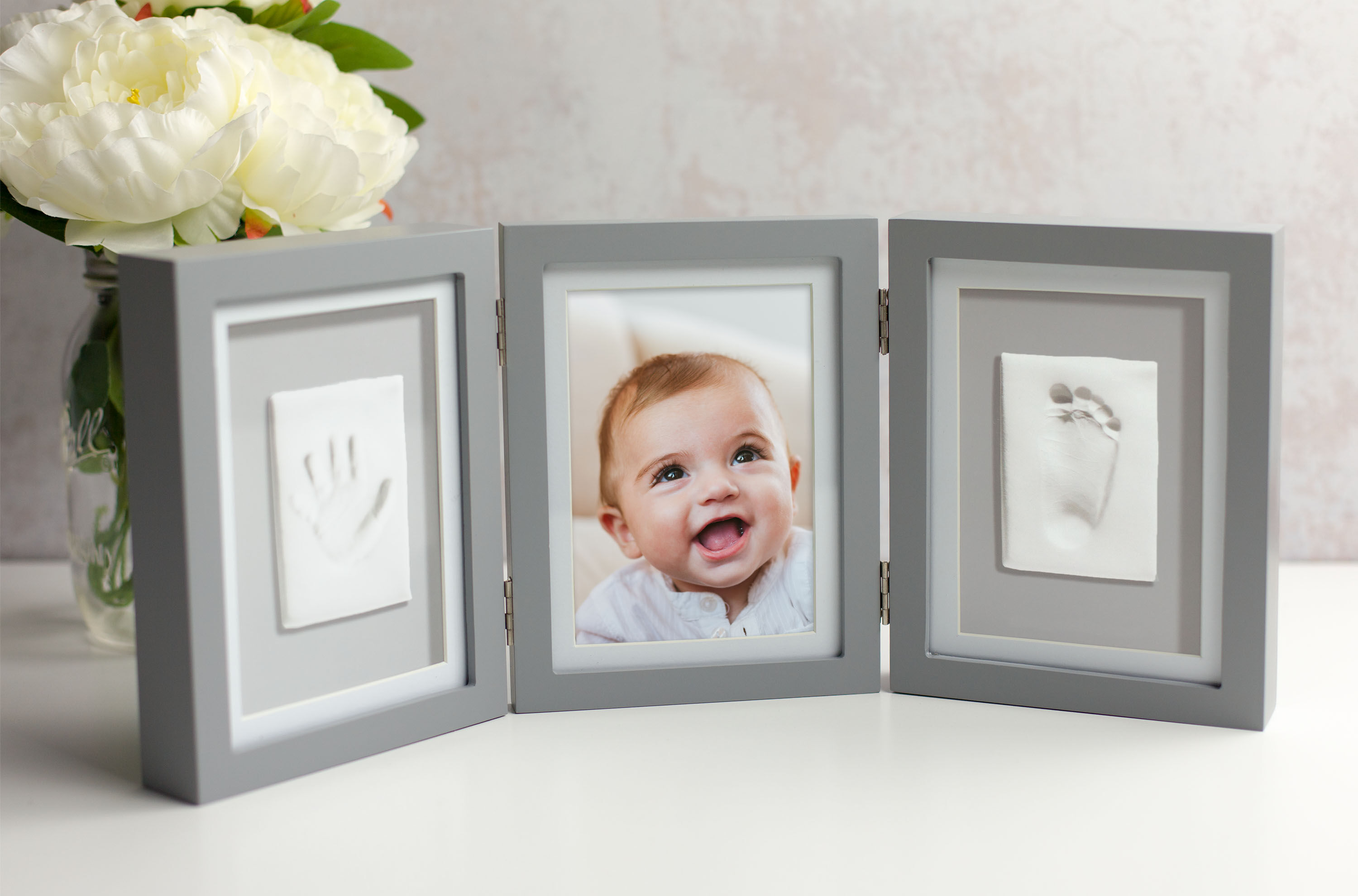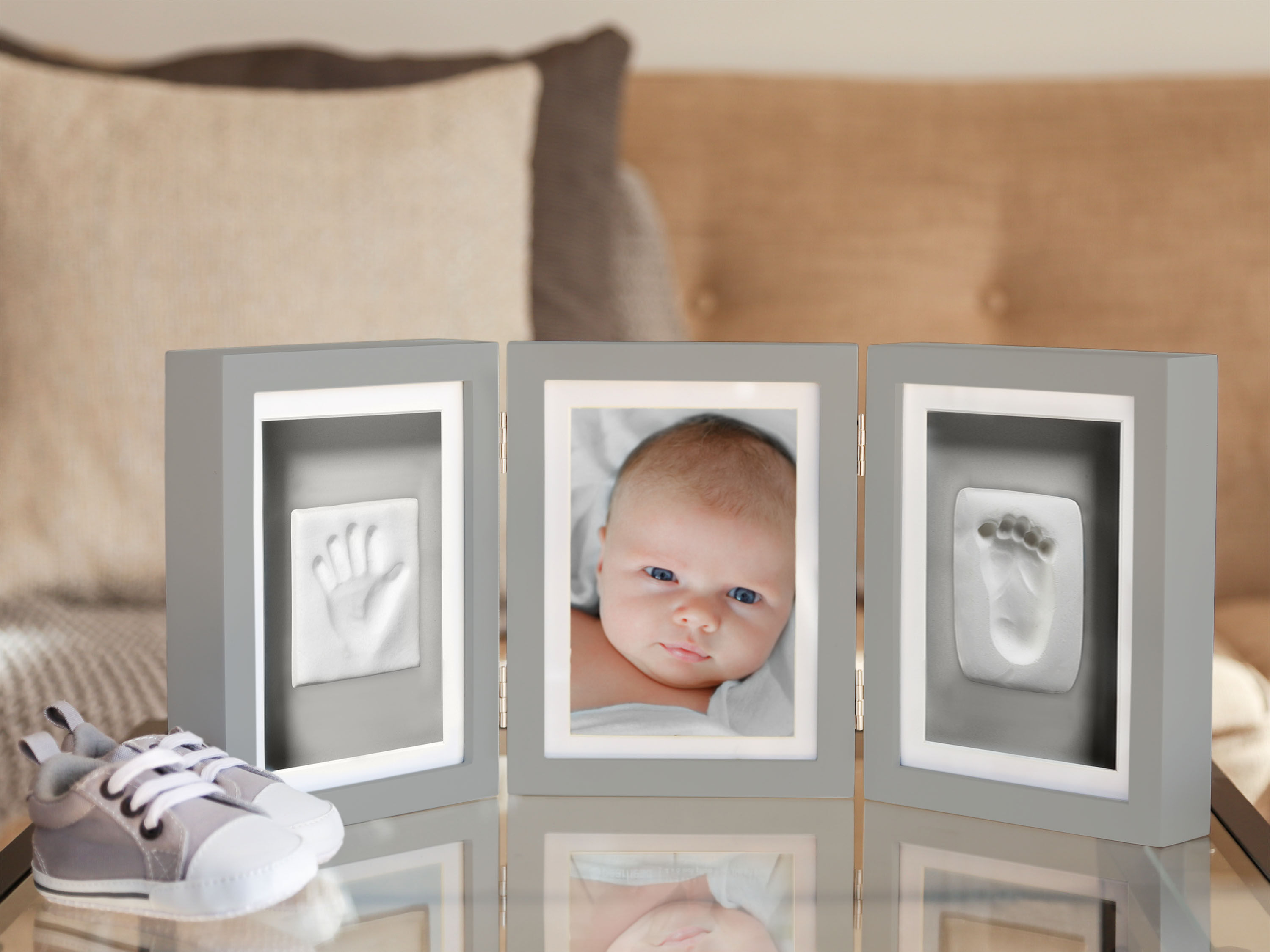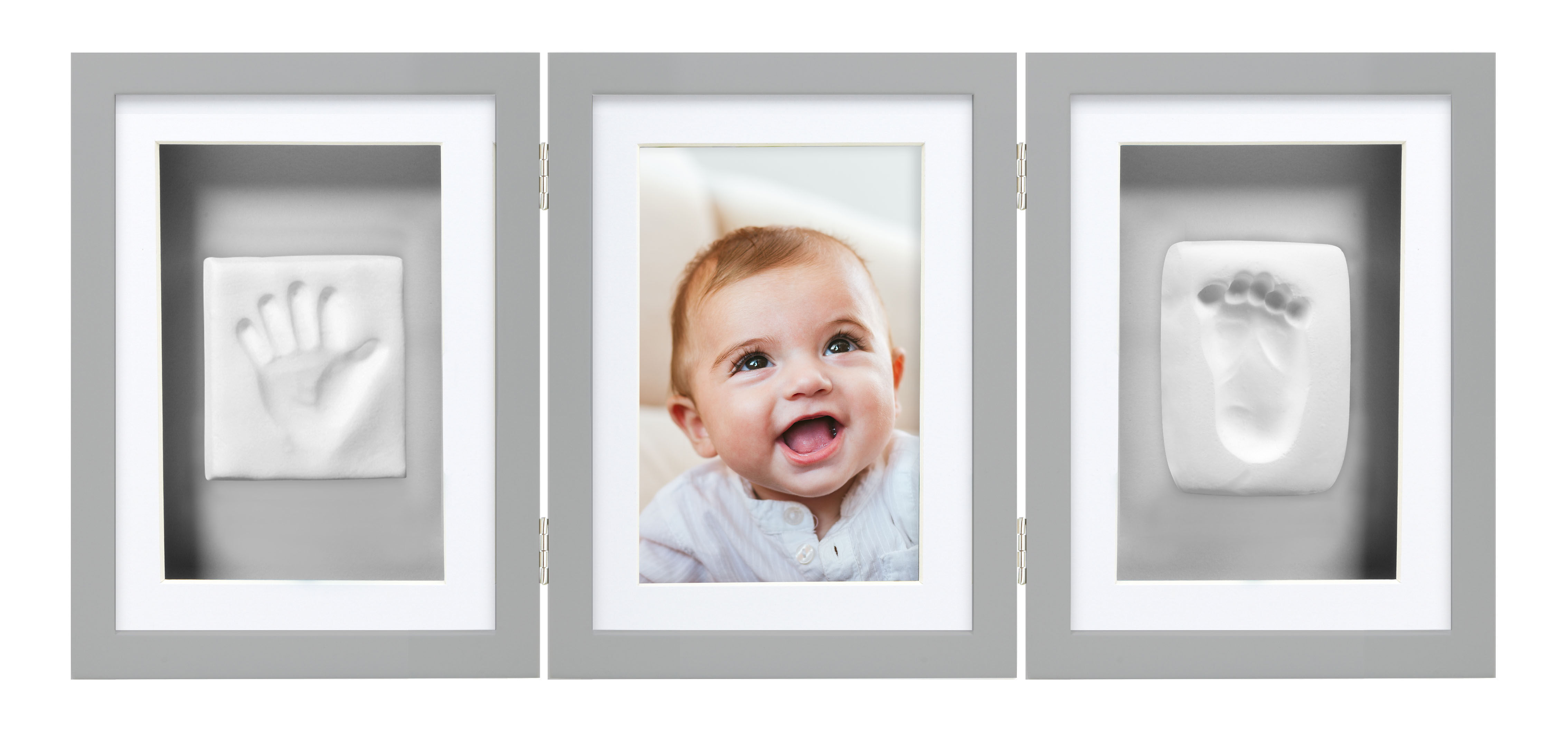 Pressa barnets lilla hand och fot i den giftfria, mjuka lufttorkande leran och placera i ramen. Förpackningen inkluderar en grå bakgrund. En perfekt present till någon annan, eller dig själv, som håller en hel livstid.