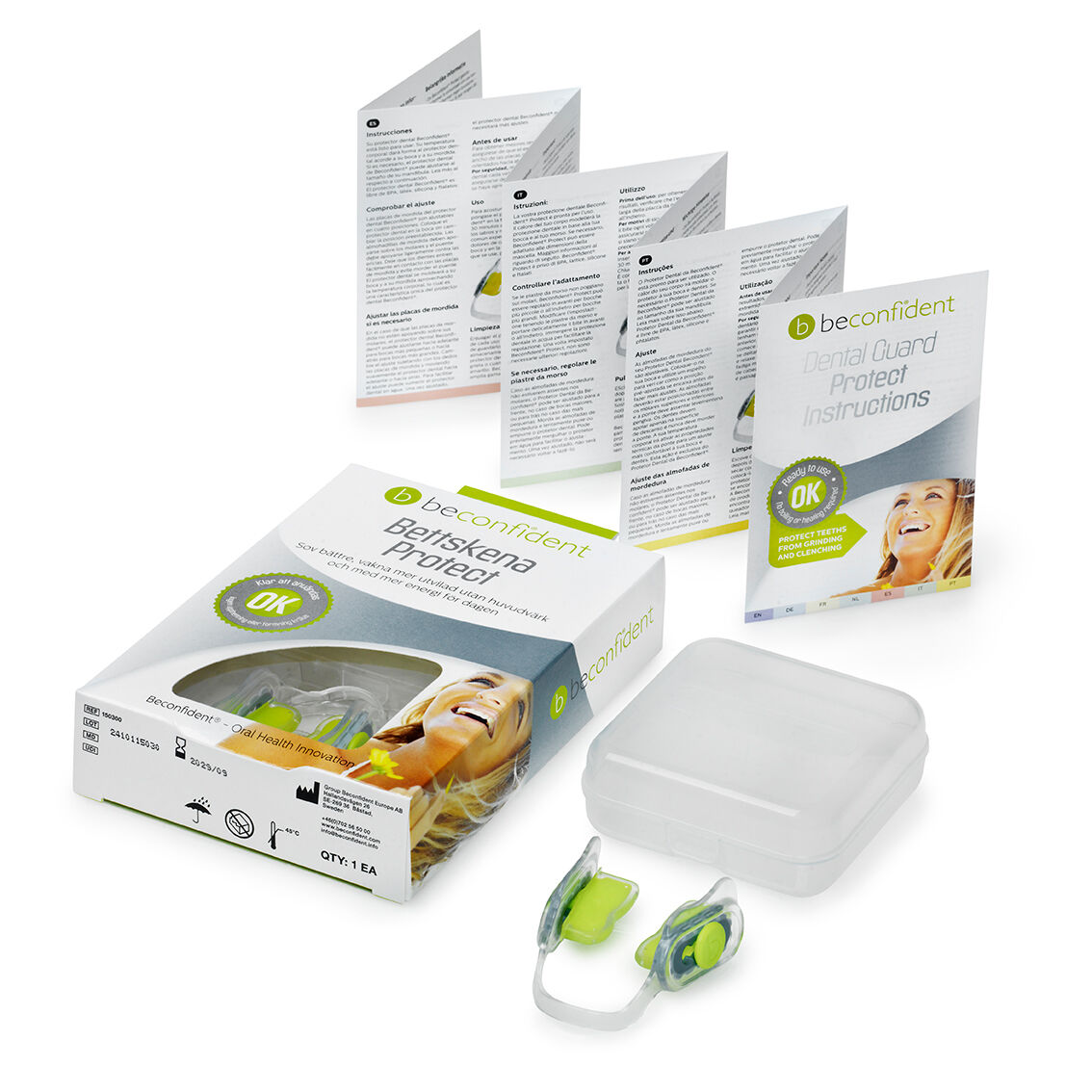 Beconfident Dental Guard Protect är ett specialutformat tandgnisslingsskydd framtaget för att skydda tänderna och avlasta käkmuskulaturen under natten. Tandgnissling och pressning av tänder, även kallat bruxism, kan leda till betydande förslitningar på tuggytorna, sprickbildningar i emaljen samt återkommande huvudvärk och smärta i käklederna. Genom att använda detta bettskydd skapas en mjuk barriär som effektivt dämpar trycket och förhindrar direktkontakt mellan tandraderna. Dental Guard Protect är unik i sin konstruktion då den är redo att användas omedelbart utan krav på uppvärmning eller formning i kokande vatten. Den smala och flexibla designen säkerställer att andningen förblir obehindrad under sömnen samtidigt som skyddet sitter tryggt på plats. Materialet är helt fritt från BPA, silikon och akryl, vilket gör det till ett säkert val för daglig användning. Förpackningen inkluderar även en förvaringsbox som håller skyddet rent och hygieniskt under dagen.