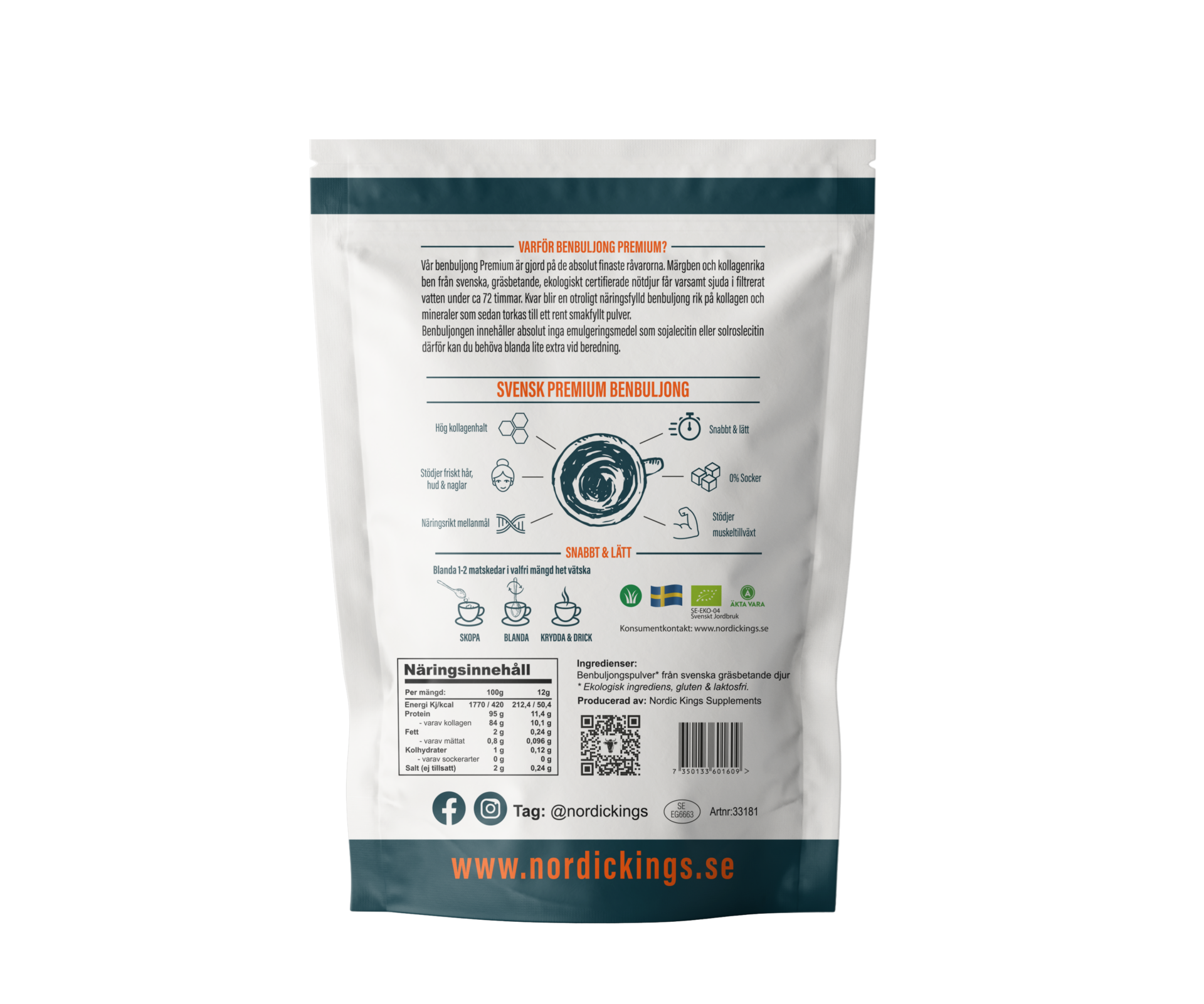 Nordic Kings Benbuljong premium är gjord på de absolut finaste råvarorna. Märgben och kollagenrika ben från svenska gräsbetade, ekologiskt certifierade nötdjur får varsamt sjuda i filtrerat vatten under ca 72 timmar. Kvar blir en otroligt näringsfylld benbuljong rik på kollagen och mineraler som sedan torkas till ett rent smakfyllt pulver. Benbuljongen innehåller absolut inga emulgeringsmedel som sojalecitin eller solroslecitin därför kan du behöva blanda lite extra vid beredning.