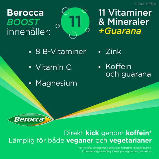 Denna skräddarsydda blandning innehåller vitaminer som B2, B3, B5, B12, vitamin C och magnesium, som tillsammans hjälper till att minska trötthet och utmattning. Dessutom innehåller den koffein från källor som guarana, vilket ökar din uppmärksamhet och förbättrar din koncentration. Berocca Boost är både glutenfri och vegansk, vilket gör den till ett lämpligt val för olika kostpreferenser.