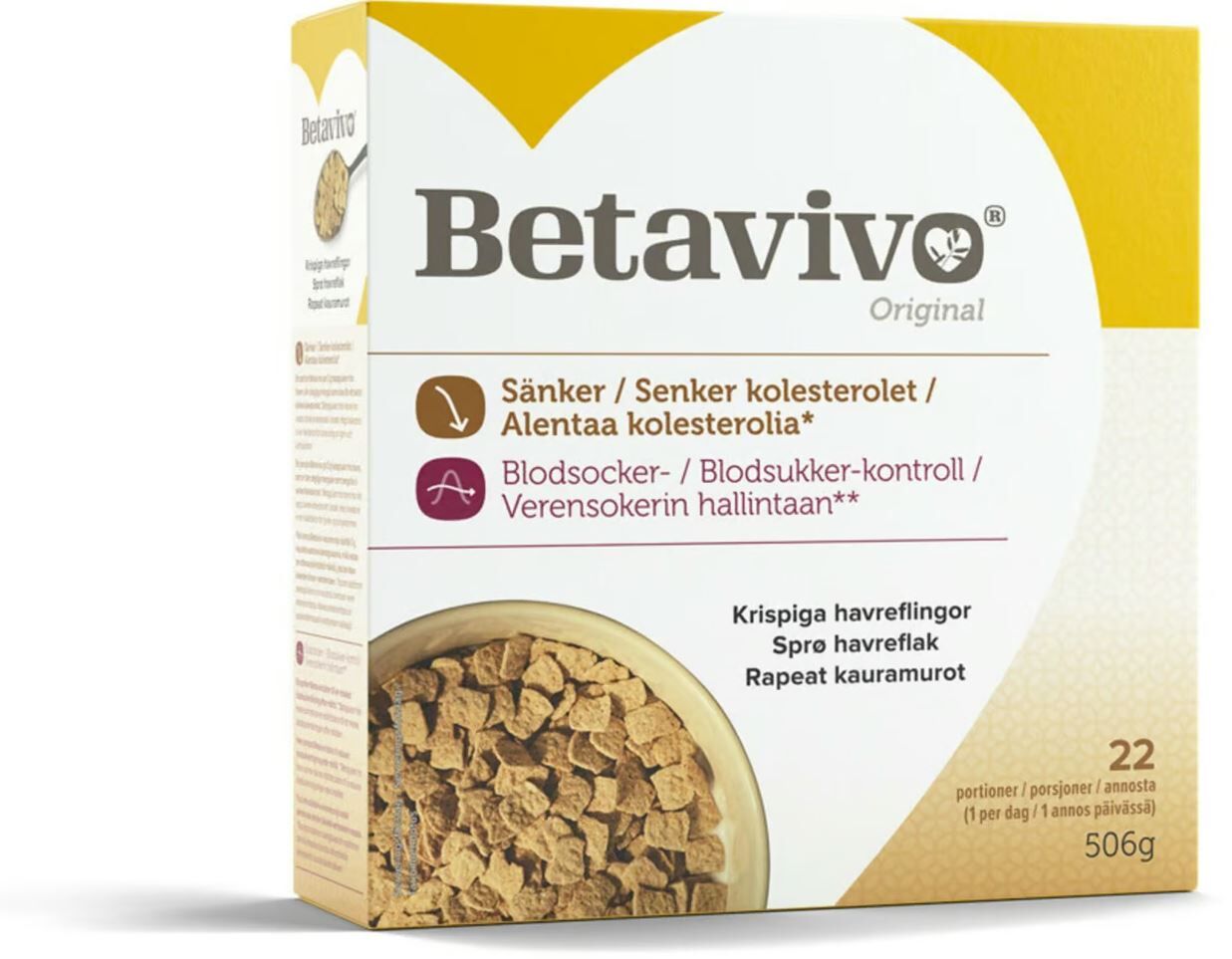 Betavivo flingor innehåller betaglukan från havre, som har visats sänka kolesterolet. Intag av betaglukan från havre som en del av en måltid bidrar även till att minskarblodsockerhöjningen efter måltid. Båda effekterna är dokumenterat positiva för hälsan. Betavivo är ett naturligt sätt att sänka kolesterolet, utan biverkningar. En portion är 0,9 dl och ska intas dagligen (du kan dela upp mängden under dagen). Kan tex serveras på yoghurt eller fil.