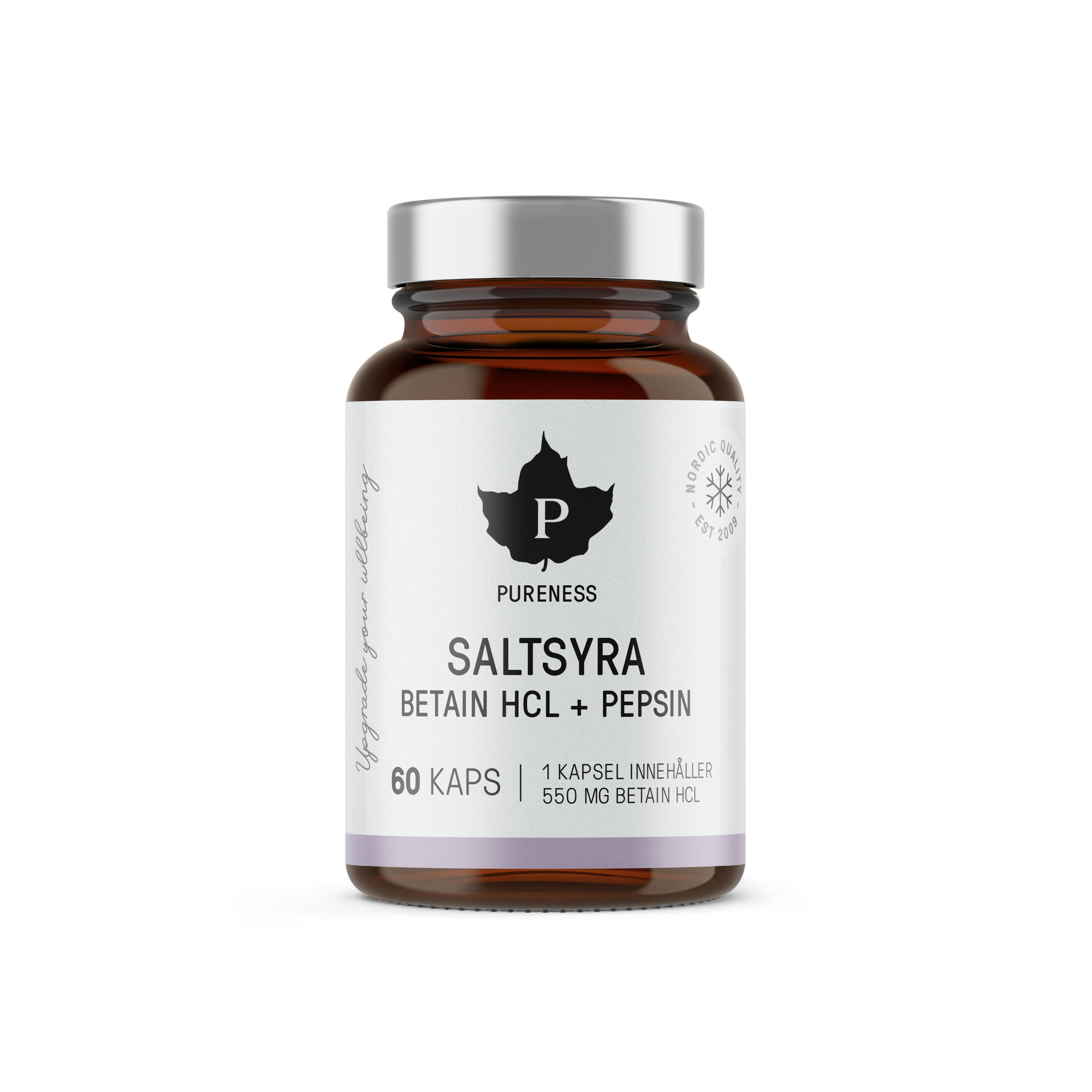 Pureness saltsyrakapslar med Betain HCl och pepsin effektiviseras kroppens egen produktion av saltsyra. Dessutom bidrar den till bearbetningen av näringsämnen i kroppen så att de absorberas bättre. Magsäcken behöver tillräckligt med saltsyra för matsmältning, intag av näringsämnen och pepsinenzym för att spjälka proteiner. Om kroppens egen saltsyreproduktion är otillräcklig och magen har för låg surhetsgrad, märks detta som matsmältnings- och magproblem, till exempel halsbränna, som kan mycket troligt bero på brist av saltsyra.
