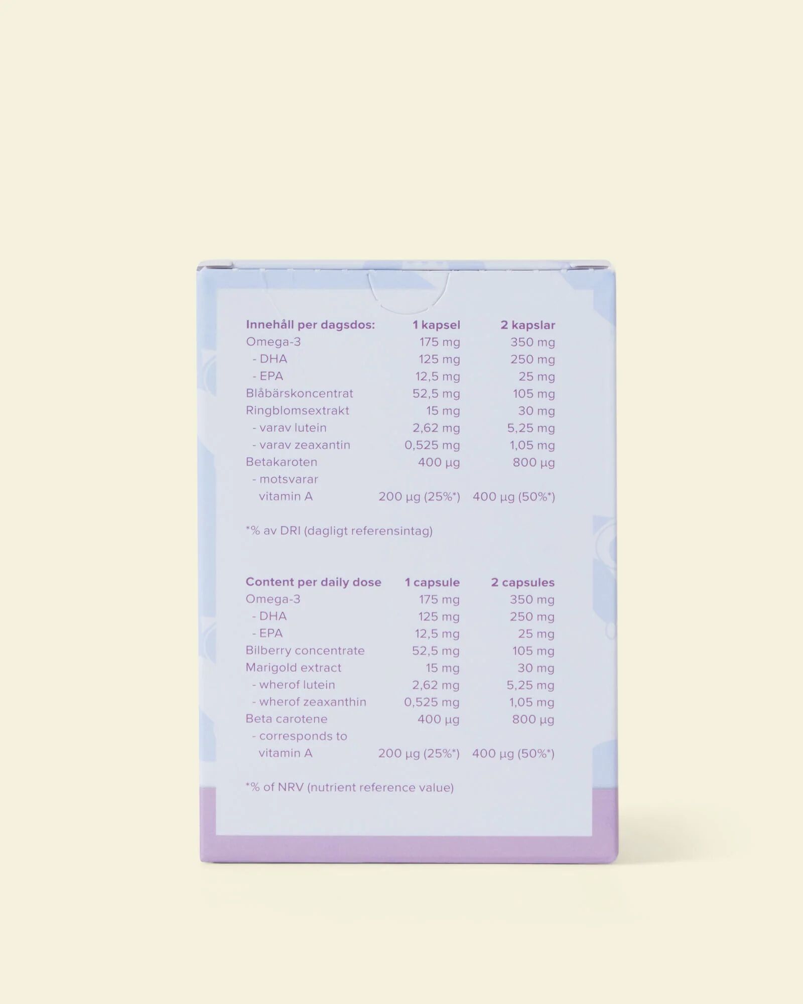 Längst bak i ögat sitter näthinnan, en tunn hinna som klär ögonbottens insida. I näthinnan finns alla våra miljontals synceller, s.k. stavar och tappar, som tar emot och registrerar ljuset som kommer in i ögat när du tittar på något. Syncellerna omvandlar sedan ljuset till nervimpulser som skickas till hjärnan via synnerven. Stavarna kan registrera skillnader i ljusstyrka och hjälper dig att kunna se i dovt ljus eller mörker. Omega-3 fettsyran DHA utgör 50–70% av de fettsyror som finns i stavarnas yttre segment i näthinnan. DHA bidrar till att bibehålla hjärnans och synens normala funktion.