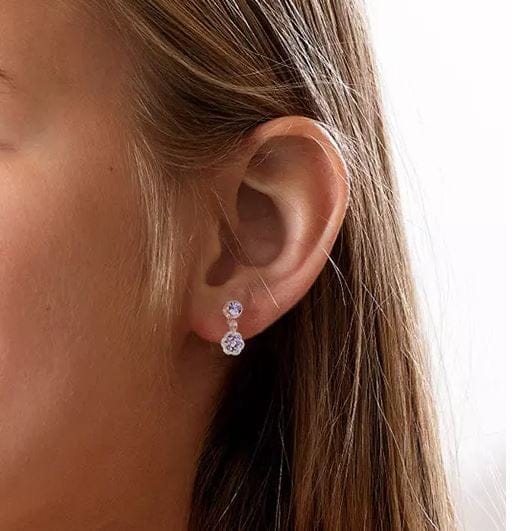 Hudvänliga örhängen från Blomdahl i form av små hängande blommor med gnistrande lila kristaller. Örhängena är tillverkade i ren medicinsk plast och utvecklade i samråd med hudläkare. De är lätta och bekväma att bära och det transparanta materialet gör att de vackra kristallerna i smycket framhävs ännu mer.