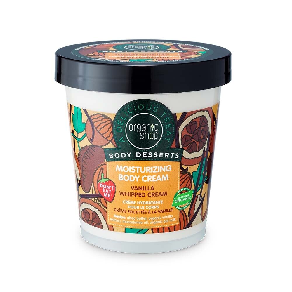 Body Desserts Vanilla Whipped Cream Moisturizing Body Cream 450 ml från Organic Shop är en rik och näringsgivande kroppskräm som lugnar huden och ger en silkeslen känsla. Den krämiga formulan är perfekt för dig som söker intensiv återfuktning och mjukgörande kroppsvård, särskilt när huden känns torr eller stram. Med macadamiaolja och ekologiskt vaniljextrakt omsluts huden av näring och en varm, behaglig doft, medan sheasmör och ekologisk havremjölk hjälper till att ge långvarig fukt och komfort. Resultatet är en mjuk, smidig och välmående hud med en lyxig känsla efter varje applicering.