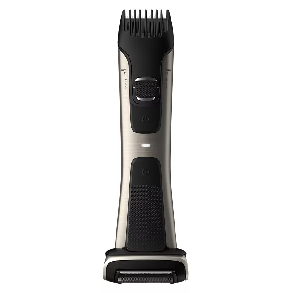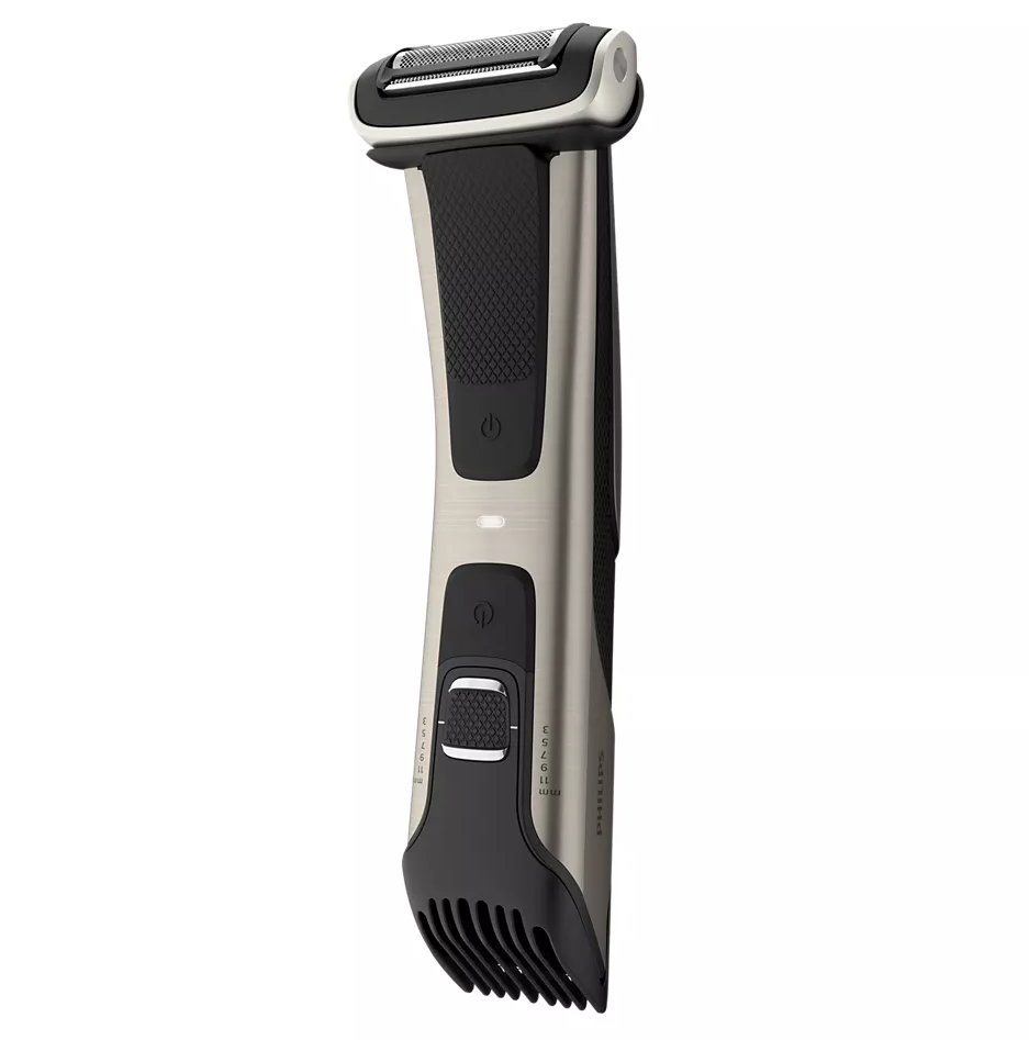 Ta bort hår på kroppen på ett smidigt sätt. Med Philips dubbelsidiga bodygroomer kan du välja mellan att ta bort håret helt eller behålla kortare stubb. Trimmerkammen har fem längdinställningar för att kunna användas på hela kroppen medan rakhuvudet anpassar sig efter kroppens konturer och ger en nära, bekväm rakning. Den här modellen har vår längsta batteritid med 80 minuters sladdlös användning efter endast en timmes laddning.