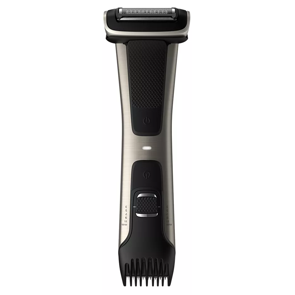 Nu kan du trimma och raka hela kroppen nedanför halsen på ett säkert sätt med bara ett verktyg. Använd Philips Bodygroom 7000-trimmer och rakapparat för hela kroppen för att trimma med ett enda tillbehör och få ett jämnt resultat på rygg, axlar, bröst, mage, underarmar, armar, ljumskar och ben.