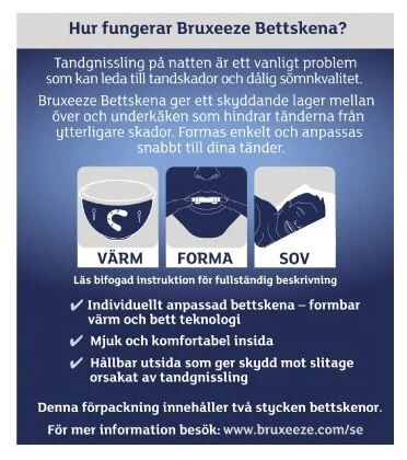 Att gnissla tänder på natten (bruxism) är ett vanligt problem som kan orsaka tandskador och ge dålig sömn. Bruxeeze är en bettskena som används när du sover för att ge ett skyddande lager mellan över- och underkäken och på så sätt motverka ytterligare skador på tänderna. Kan användas antingen i överkäken eller underkäken. Bettskenan formas enkelt för att anpassas till dina tänder.