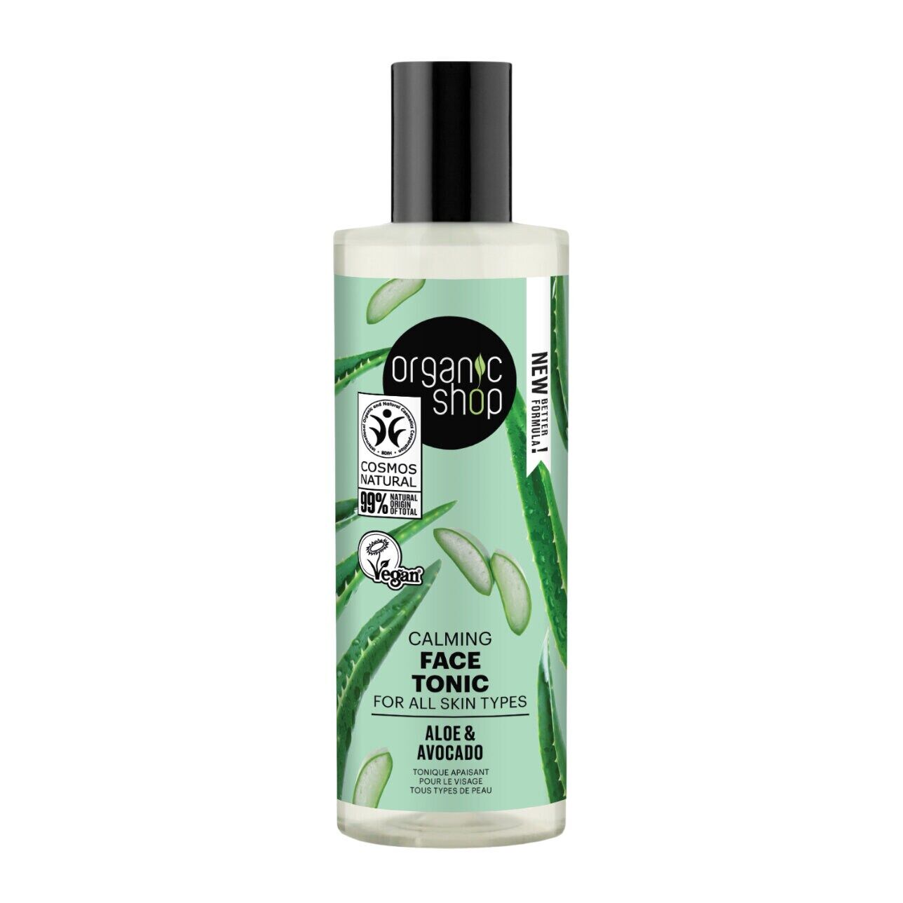 Organic Shops prisvänliga hud- och hårvårdsprodukter är framställda med minst 95 % naturliga ingredienser och är fria från färgämnen och parabener. Produkterna innehåller ekologiskt certifierade oljor och extrakt samt kommer i återvinningsbara och biologiskt nedbrytbara förpackningar. Ansiktsvattnet är certifierat veganskt och/eller enligt COSMOS Natural.