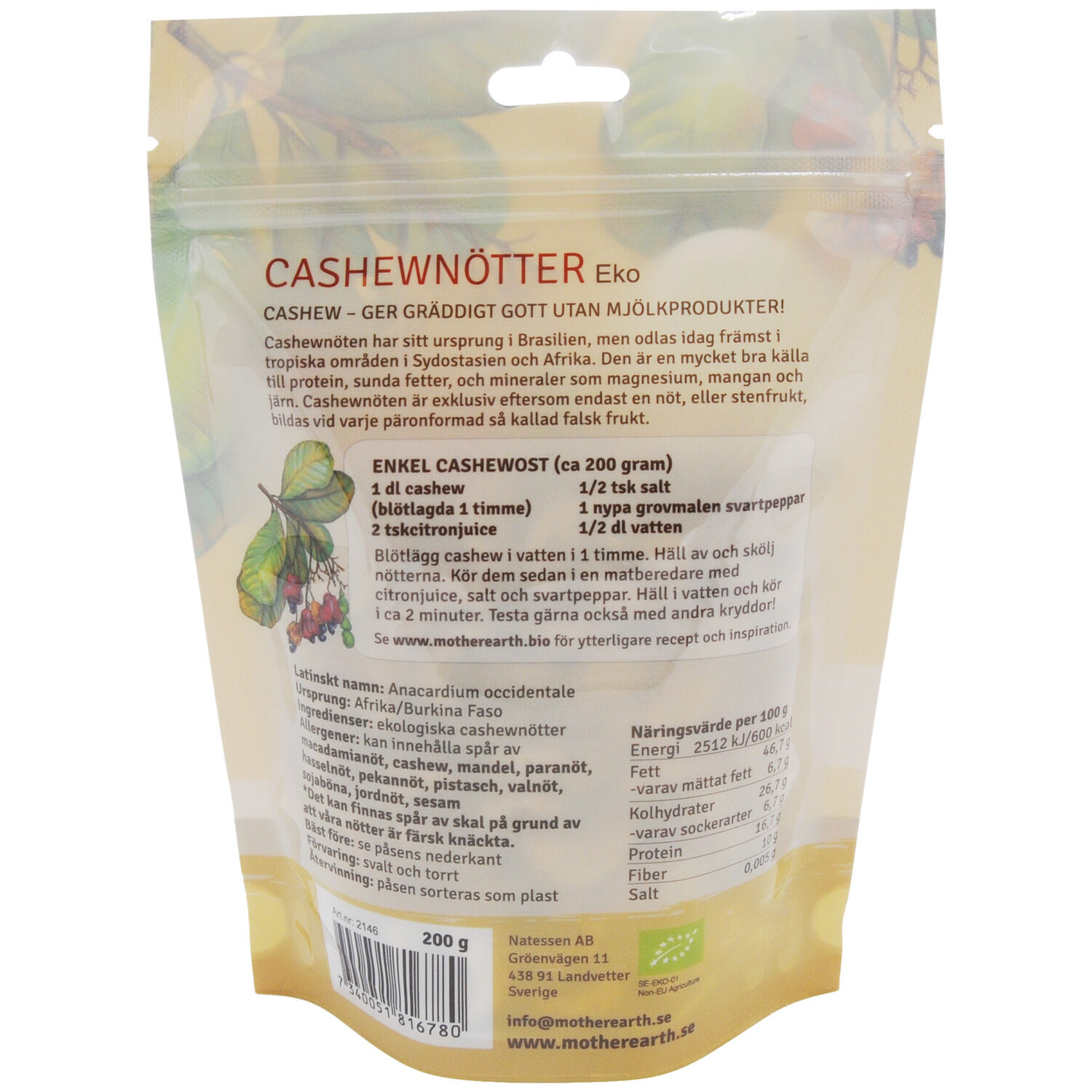 Latinskt namn: Anacardium occidentale Ingredienser: Ekologiska cashewnötter Ursprung: Afrika/Burkina Faso Förvaring: Förvaras torrt och svalt