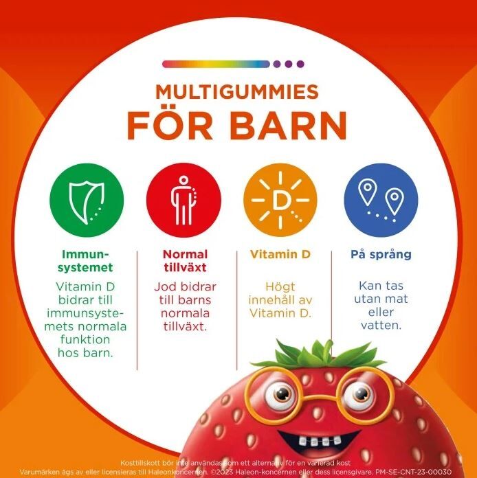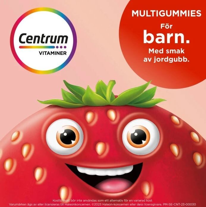 Centrum Barn Multigummies är en välsmakande gummie med vitaminer och mineraler, och med smak av jordgubb. Tuggbar och kan tas när och var du vill. Bland annat berikade med vitamin A, B, C, D och Zink. För barn från 4 år.