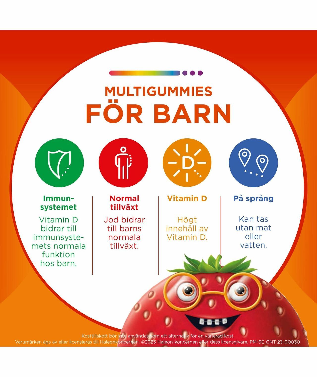 Glukossirap, socker, gelatin (nötkreatur), Vitamin C (L-askorbinsyra), syra (citronsyra), Niacin (nikotinamid), maltodextrin, Vitamin E (DL-alfa-tokoferylacetat), Zink (zinksulfat), naturliga smakämnen 0,25% (apelsin, jordgubb, hallon), färgämnen 0,15% (koncentrat av röd rädisa, safflor, körsbär, svart morot, svartvinbär), vegetabilisk olja (kokos, raps), Vitamin B6 (pyridoxinhydroklorid), Vitamin A (retinylacetat), ytbehandlingsmedel (karnaubavax, bivax), Jod (kaliumjodid), Biotin (D-biotin), Vitamin D (kolekalciferol), Vitamin B12 (cyanokobalamin).