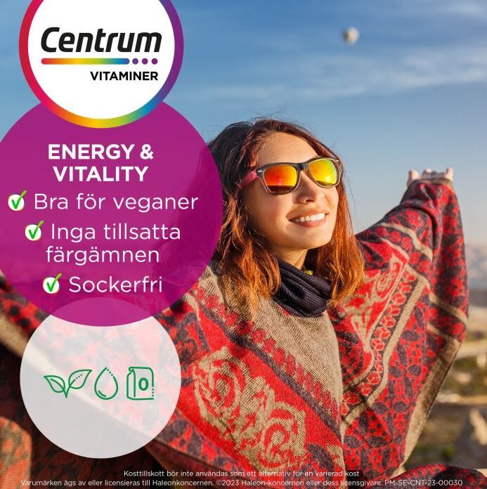 Centrum Energy & Vitality är ett innovativt format i form av en shot som är redo att drickas. Utvecklad av experterna på Centrum med stöd av över 40 års forskning och erfarenhet av näringslära. Varje liten flaska innehåller en shot med hög dos vitamin B12 (500g) för att bibehålla din energinivå och zink som bidrar till normal kognitiv funktion. Vitamin B12 bidrar till normal bildning av röda blodkroppar och tillsammans med zink är dessa viktiga för en vegansk kost.
