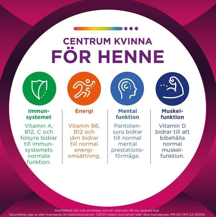 Centrum Kvinna är ett kosttillskott med vitaminer och mineraler speciellt utvecklat för kvinnors näringsbehov. Centrum Kvinna innehåller vitaminerna A, B12, C och folsyra som bidrar till immunsystemets normala funktion. Vitamin B6, B12 och järn bidrar till normal energiomsättning. Pantotensyra bidrar till normal mental prestationsförmåga. Vitamin D bidrar till att bibehålla normal muskelfunktion. 1 tablett per dag.