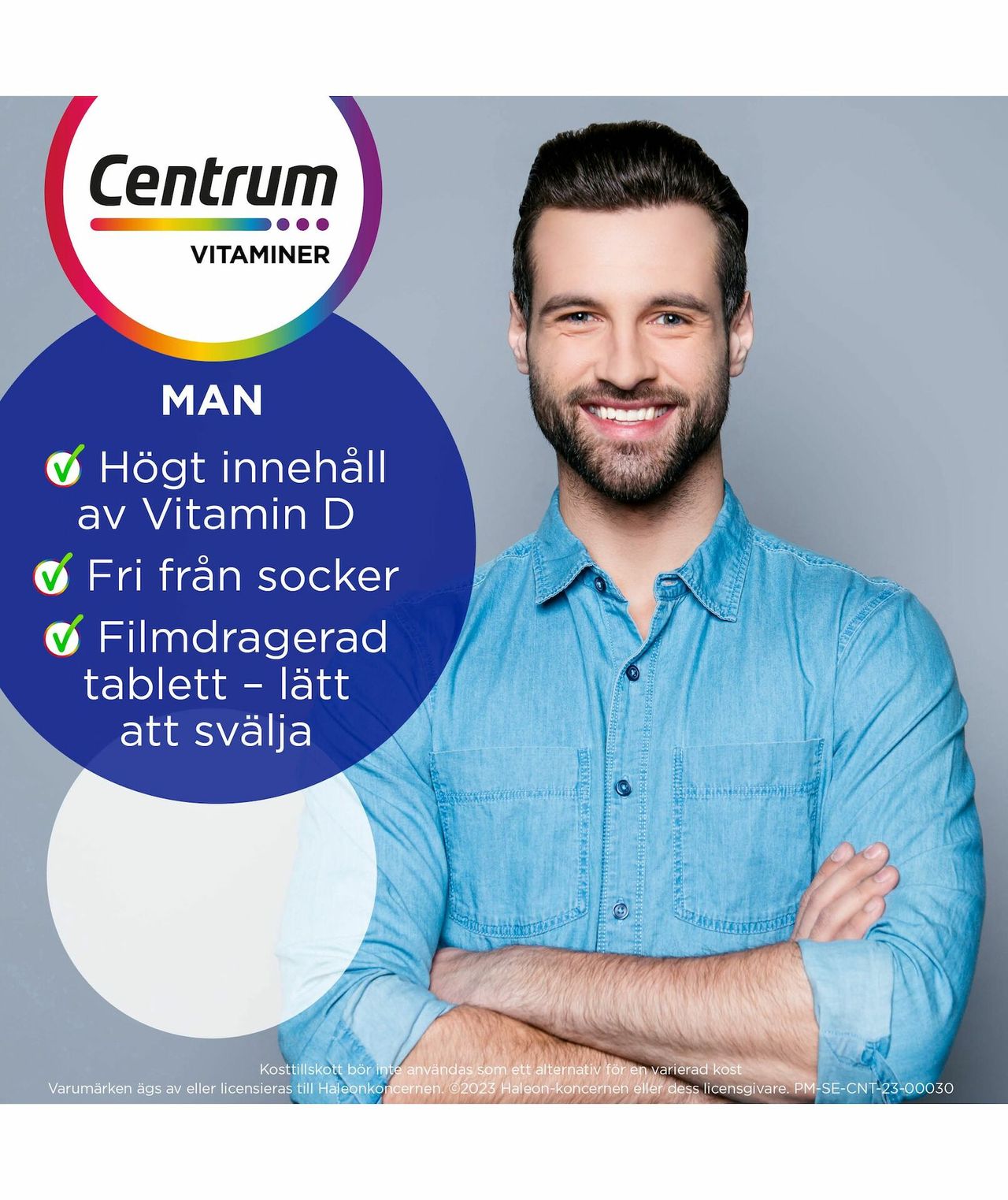 Centrum Man är ett kosttillskott speciellt utvecklat för mäns näringsbehov och består av flera olika vitaminer och mineraler. Varje tablett innehåller en komplett mix av mikronäringsämnen, varav 10 µg D-vitamin. Tabletterna är lätta att svälja.