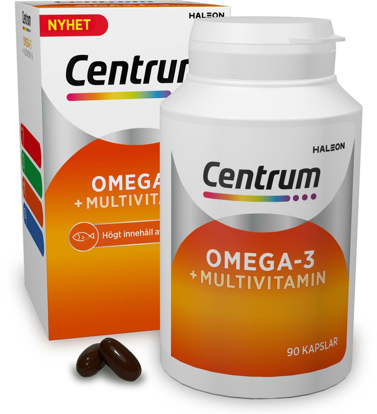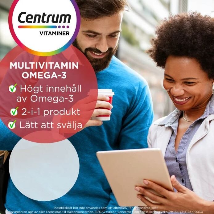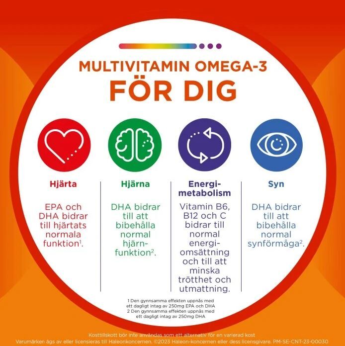 Centrum Omega-3 + Multivitamin är en komplett 2-i-1 multivitamin, rik på Omega-3. Varje kapsel är lätt att svälja och innehåller en kombination av vitaminer och mineraler, med Omega-3, EPA samt DHA. Fettsyrorna EPA och DHA bidrar till hjärtats normala funktion. DHA bidrar även till att bibehålla en normal hjärnfunktion och synförmåga: