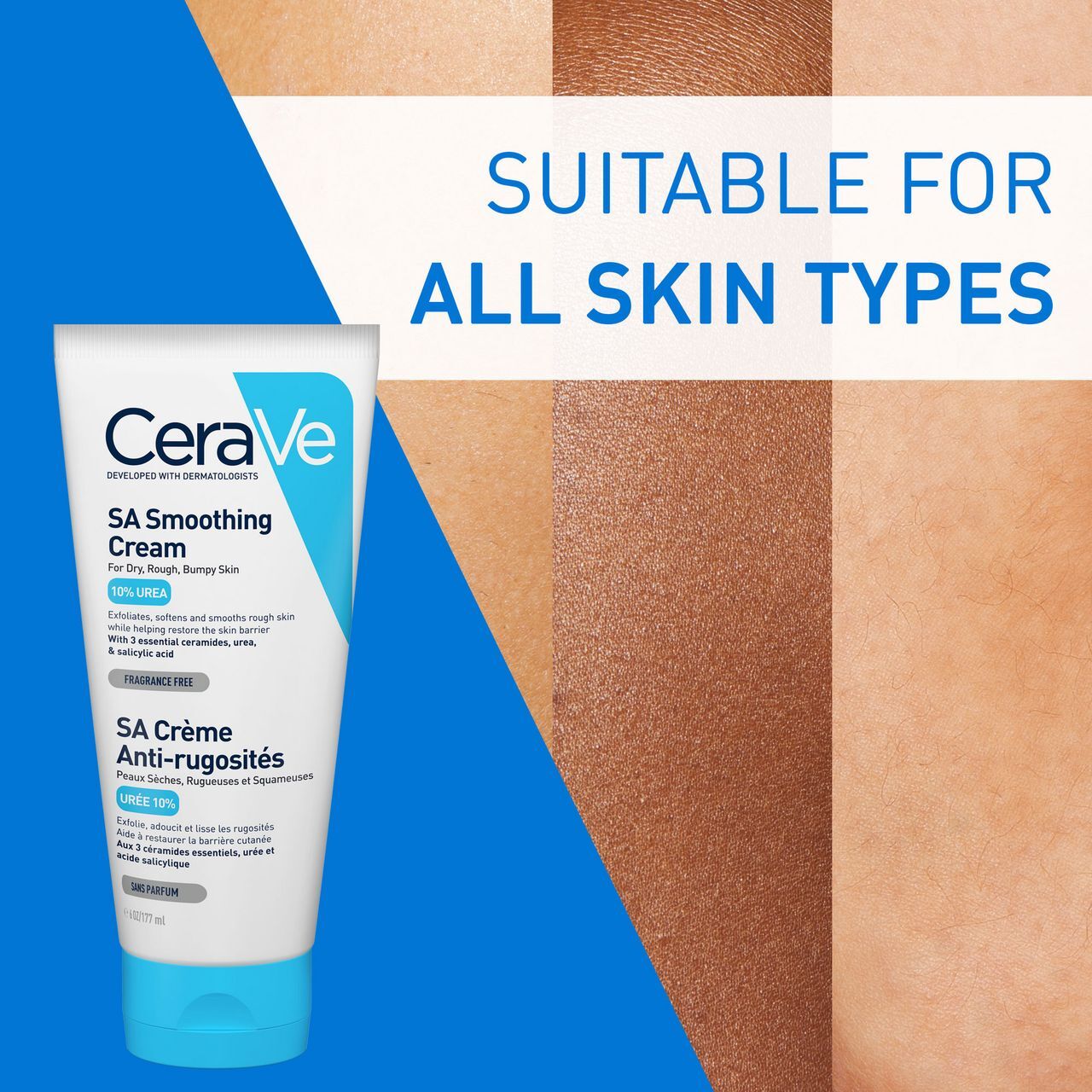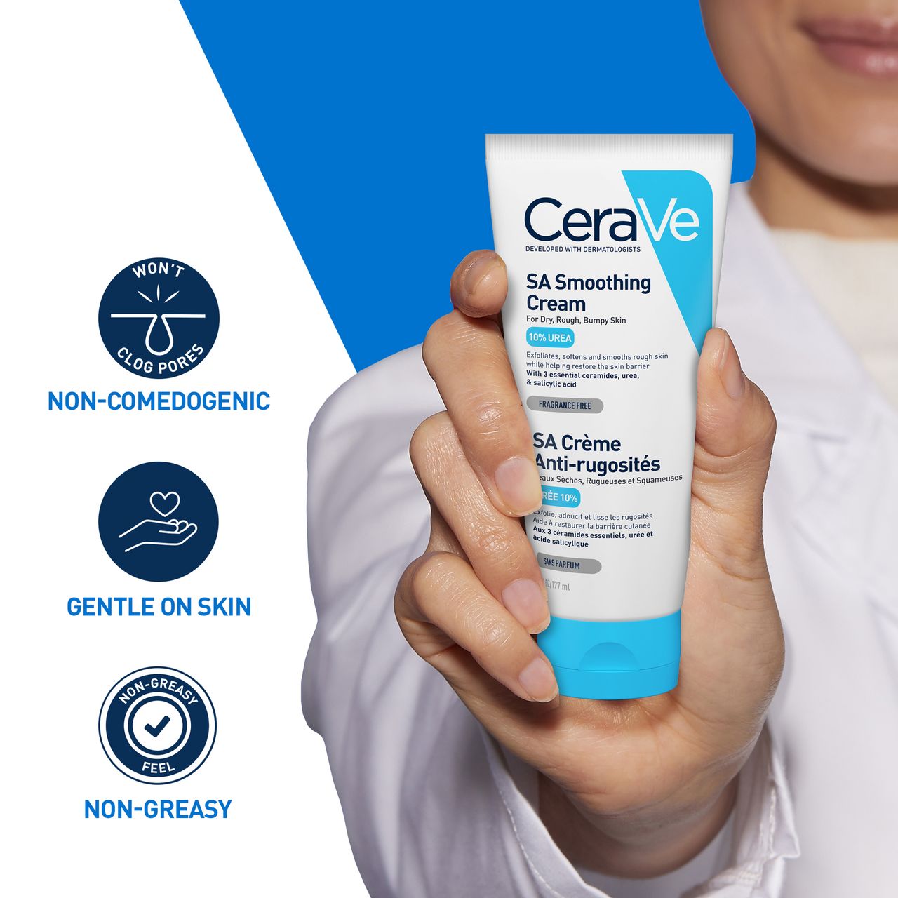 Cerave SA Smoothing Creme är en kräm för mycket torr, grov och knottrig hud på kroppen. SA Smoothing Cream är en mjukgörande hudkräm med aktiva ingredienser som skonsamt exfolierar huden. Salicylsyra och LHA hjälper till med att jämna ut och förnya huden, medan tre essentiella ceramider verkar för att återställa hudbarriären.10 % urea hjälper huden ta till sig och bevara fukt och hyaluronsyra verkar för att bevara hudens naturliga fuktnivå. Resultatet är mjukare och jämnare hud på bara tre dagar*. Applicera dagligen efter behov.