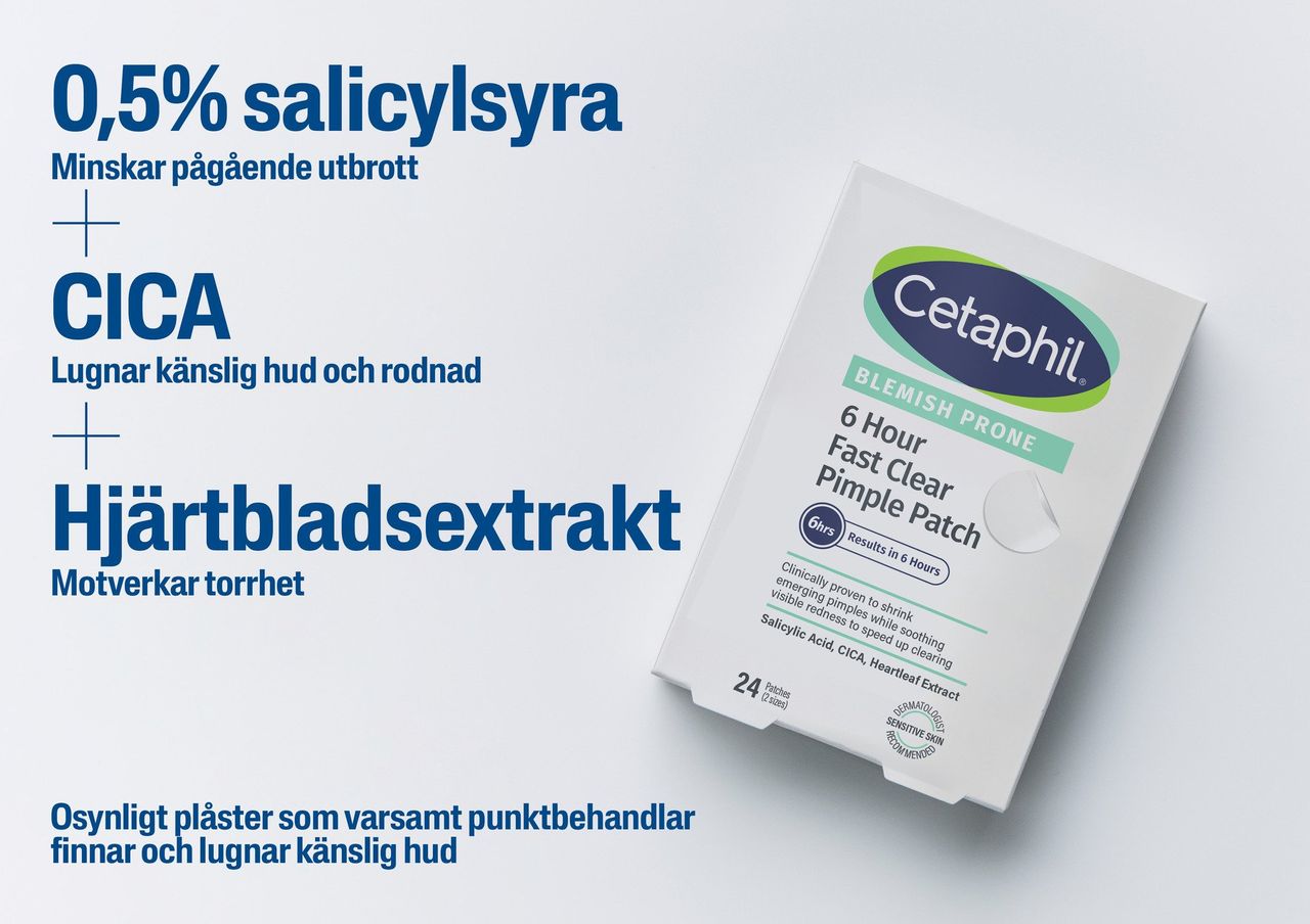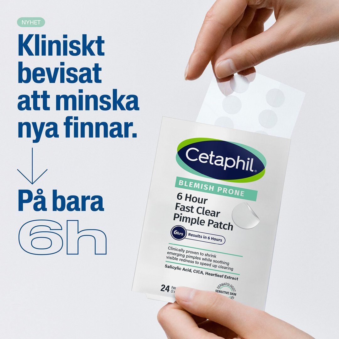 Ge dina blemmor en match med Cetaphil 6 Hour Fast Clear Pimple Patch. Dessa genomskinliga och ultratunna plåster fungerar som en diskret punktbehandling som du applicerar vid första tecknet på en blemma. På bara 6 timmar hjälper de till att lugna huden, minska rodnad och skydda området, samtidigt som de verkar vårdande i upp till 24 timmar efter att de tagits bort.