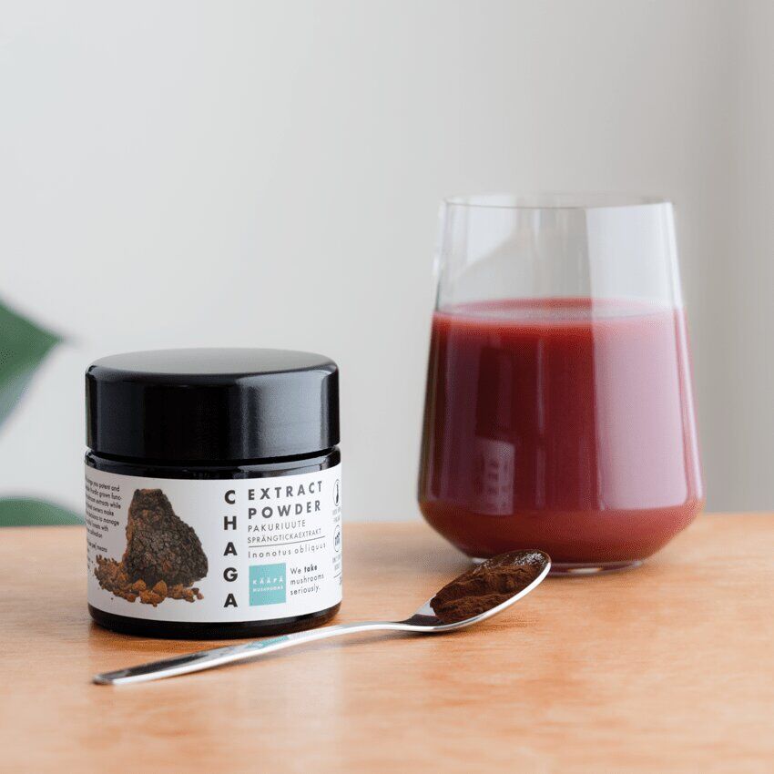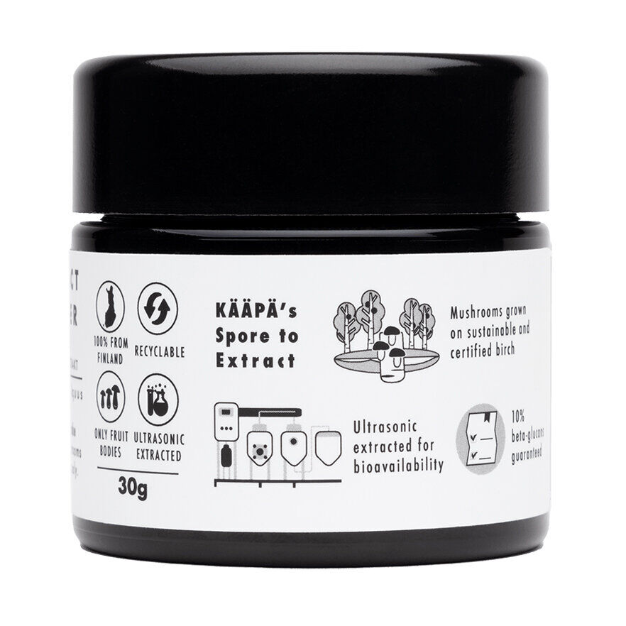 KÄÄPÄ Mushrooms starka extrakt av sprängticka dvs. Chaga är odlad i Finland. KÄÄPÄ Mushrooms produkter är 100% ekologiska, och svamparna är odlade med finsk PEFC/FSC certifierad björk som växtunderlag.