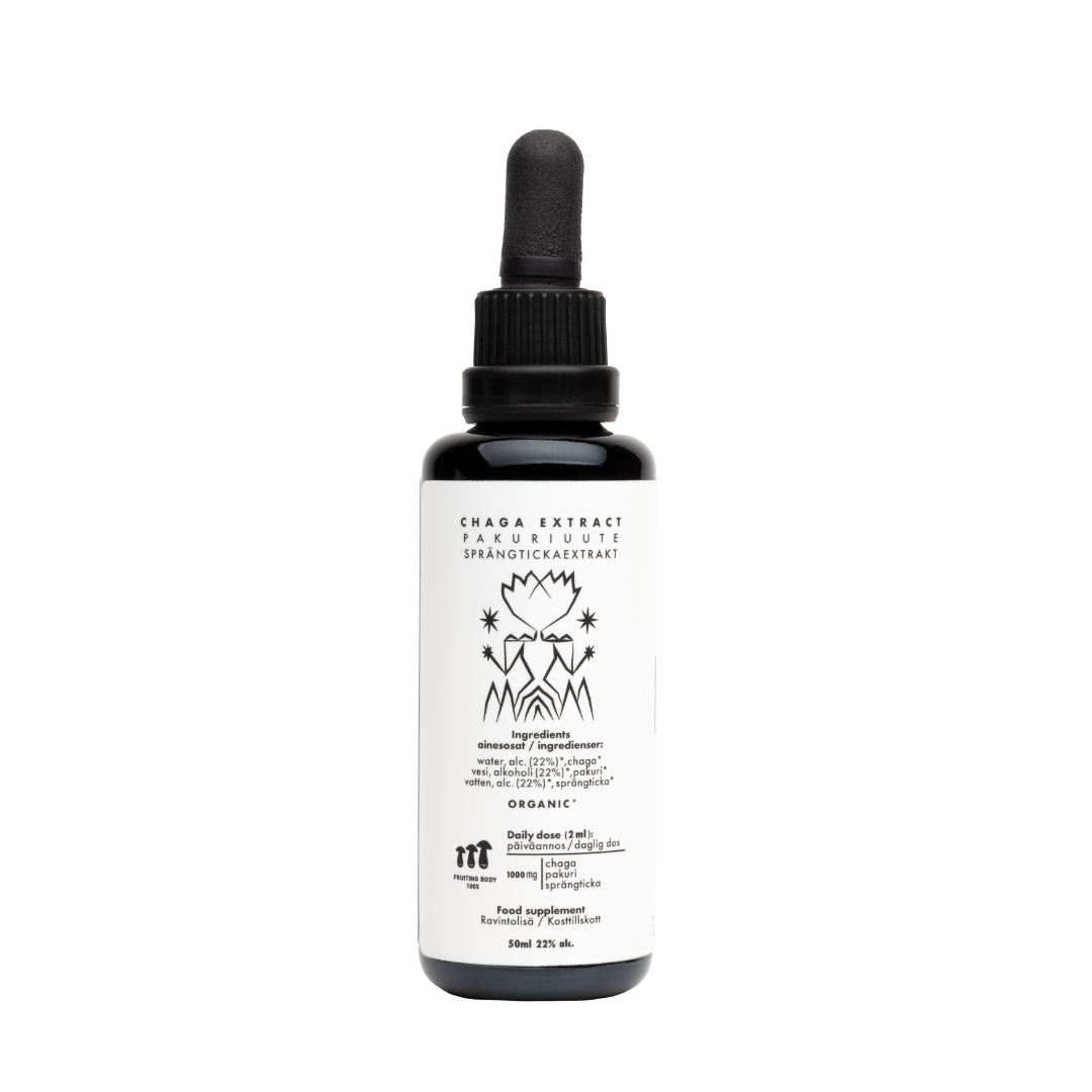 KÄÄPÄ Mushrooms högkvalitativa vatten- och alkoholextrakt av sprängticka, dvs. Chaga (Inonotus obliquus) är odlad i Finland. KÄÄPÄ Mushrooms produkter är fullständigt ekologiska, och svamparna är odlade med finsk PEFC/FSC certifierad björk som växtunderlag.