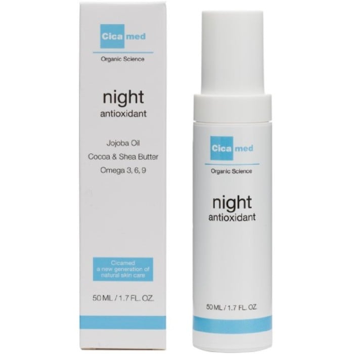Cicamed Night Antioxidant är en reparerande antiage-nattkräm som hjälper huden att återhämta sig under natten. Nattkrämen innehåller vegetabiliska oljor som är rika på vitaminer, mineraler och fettsyror som återfuktar huden på djupet när du sover. Med ekologiskt shea- och kakaosmör som hjälper till att stärka hudens barriär.
