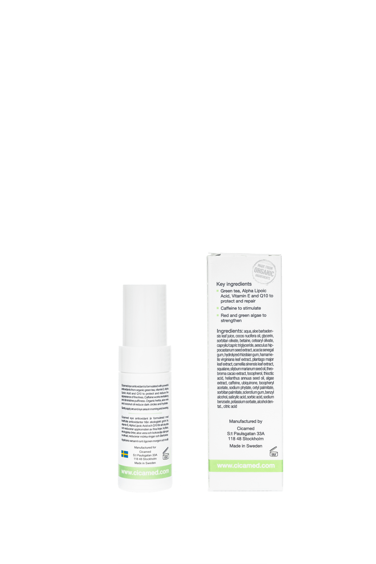 Hudens första tecken på åldrande brukar visa sig runt ögonen. Cicamed Eye Antioxidant är en ögonkräm med skyddande antioxidanter från ekologiskt grönt te, vitamin E, alpha lipoic acid och Q10. Ögonkrämen innehåller koffein som verkar stimulerande och dämpar svullnad, ekologiska örter som reducerar mörka ringar, och aloe vera och kokosolja som återfuktar och lugnar huden.