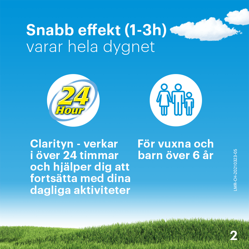 Clarityn är ett receptfritt läkemedel som lindrar symptom som hör samman med allergisk rinit (till exempel hösnuva), såsom nysningar, rinnande eller kliande näsa och sveda eller klåda i ögonen. Symptomen kan orsakas av bl.a. pollen, pälsdjur och kvalster.