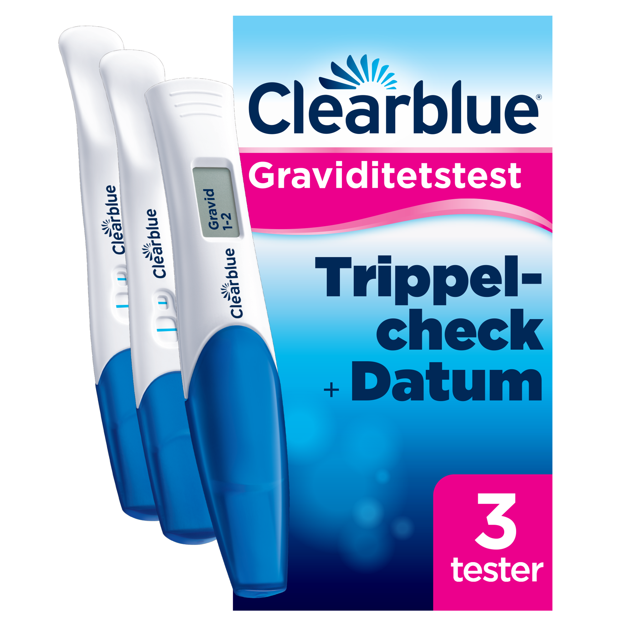3 graviditetstest för extra trygghet! Detta paket ger dig möjligheten att trippelchecka i en tidig graviditet: det innehåller ett Clearblue Digital Early Detection Graviditetstest och två Clearblue Ultra Early Graviditetstest.