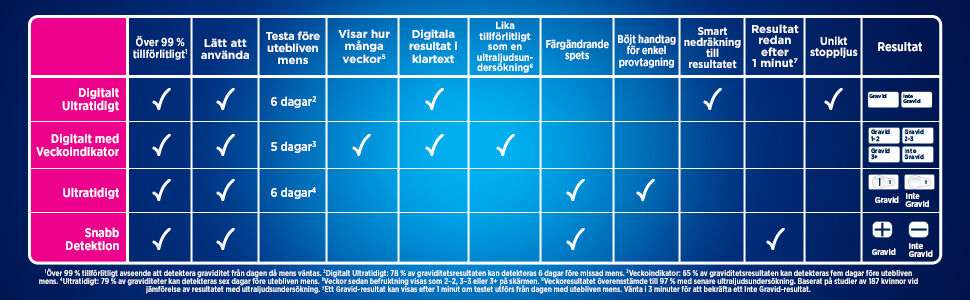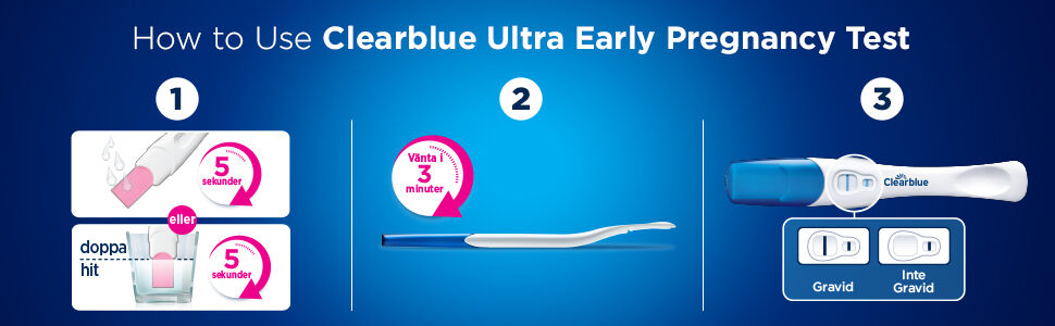Om du tror att du kan vara gravid, vill du veta det så snart som möjligt. Med Clearblue Graviditetstest Ultratidigt, kan du testa upp till 6 dagar före utebliven mens (5 dagar före väntad mens) – inget test kan ge tidigare resultat. Den är lättanvänd med ergonomiskt böjt handtag, en extra bred färgskiftande spets och Clearblue Floodguard(TM)-teknologi som hjälper till att minska antalet rapporterade användningsfel. Dessutom ger den tydliga och lättlästa resultat: två linjer betyder att du är gravid och en linje betyder att du inte är gravid.