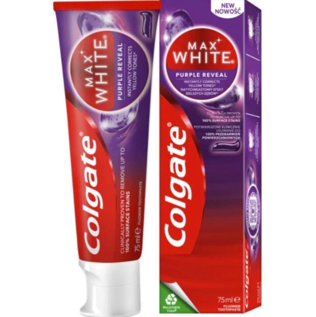 Colgate Max White Purple är en tandkräm som omedelbart gör att tänderna ser vitare ut*. Tandkrämen har en optisk färgkorrigeringsteknologi med lila färg, som omedelbart justerar gula toner till vitt. Tar bort ytliga fläckar orsakade av mat och dryck för att ge dig ett vitare leende.