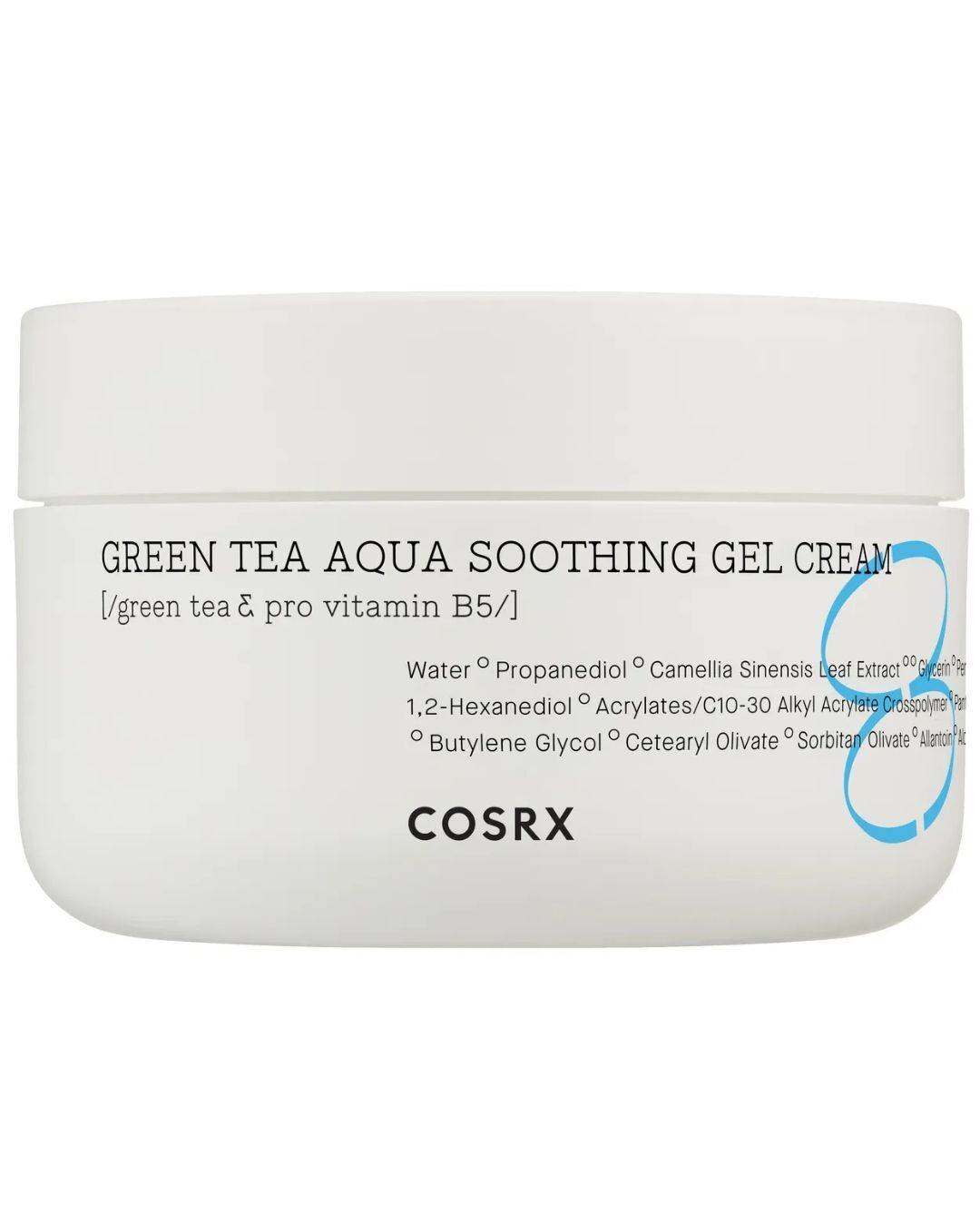 COSRX Hydrium Green Tea Aqua Soothing Gel Cream är en lätt och svalkande ansiktskräm i gelkräm-konsistens som ger intensiv återfuktning utan att kännas tung på huden. Formulan är framtagen för att snabbt absorberas och ge omedelbar fuktboost och en fräsch, kylande känsla. Med grönt te som central ingrediens hjälper krämen till att lugna huden och passar särskilt bra för dig som upplever huden som varm, fuktfattig eller obalanserad. Perfekt som daglig fuktkräm, även under makeup.