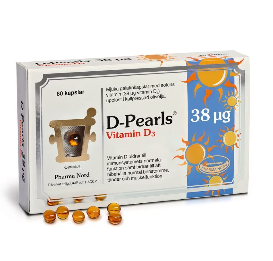 D-Pearls är små, mjuka gelatinkapslar med 38 mikrogram (1520 IE) vitamin D3 i varje kapsel. Eftersom vitamin D är en fettlöslig vitamin är den löst i kallpressad olivolja för optimalt upptag i matsmältningssystemet. D-Pearls är små och därför lätta att svälja, men de kan även tuggas om så önskas.