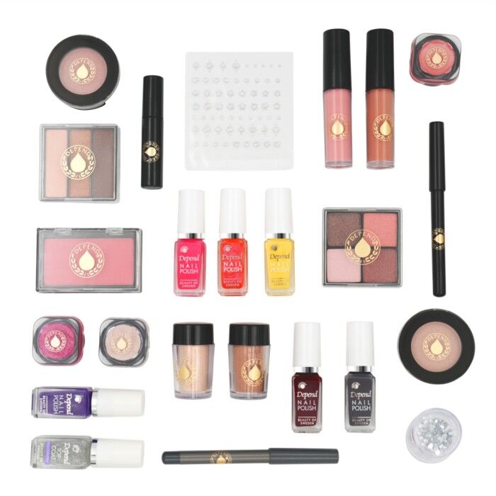 Förpackningen innehåll: 24 skönhetsprodukter från Depend.