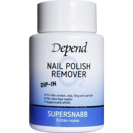 Depend O2 Dip Remover är en snabb och smidig nagellacksborttagning utan aceton. Nagellacksborttagningen finns i en burk tillsammans med bitar av skumgummi i vilken du enkelt doppar naglarna för att avlägsna nagellacket. Du behöver inte vrida på fingrarna för att nagellacket ska lösas upp, enbard doppa fingertopparna några gånger i burken och låt friktionen av skumgummit avlägsna nagellacket. Observera: Lämpar sig ej för konstnaglar.