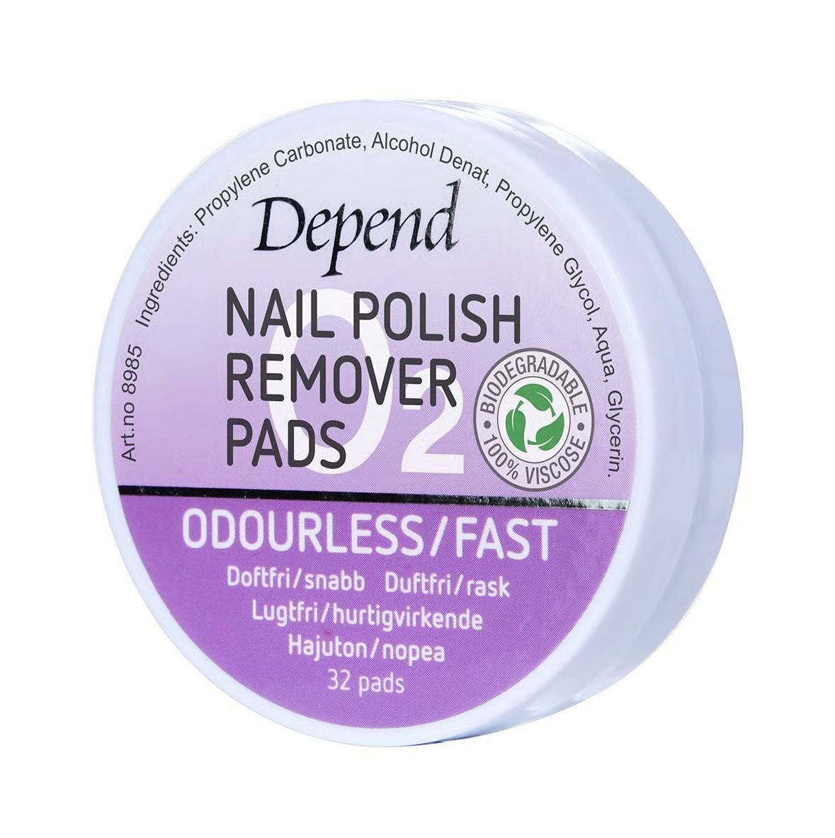 Färdiga pads för borttagning av nagellack på naturliga naglar (ej lösnaglar). Nagellacksbortagningen är fri från aceton, olja, färg och parfym. En pads kan användas till ca 10 naglar.