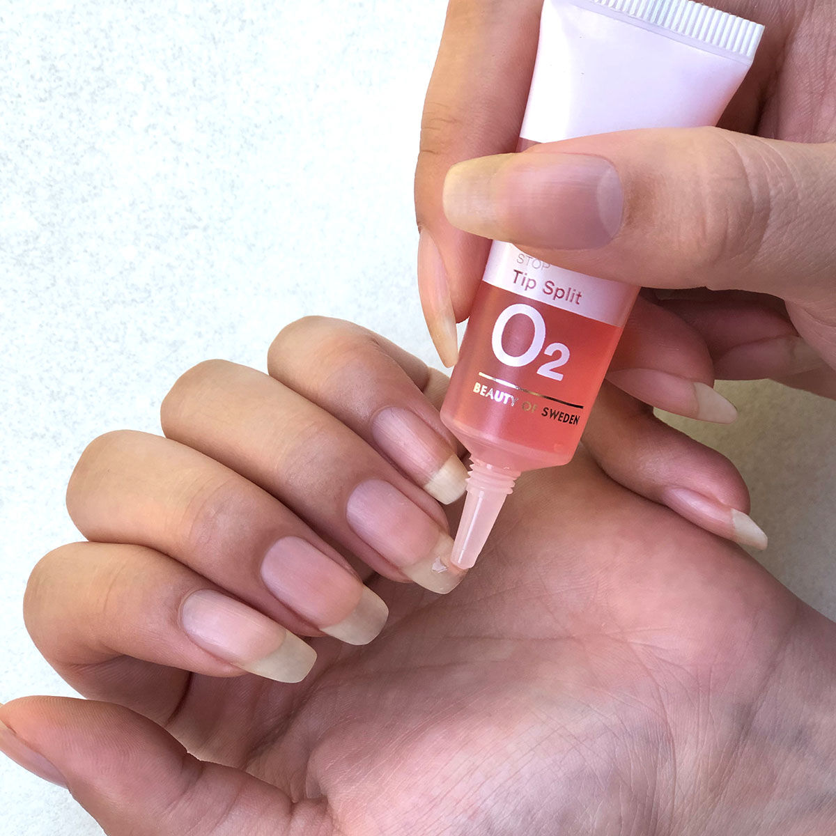 Appliceras på den flisiga nageltoppen och masseras in, användas varje dag vid behov. Används på ren nagel och utan lack. Ska du lacka nageln applicera Stop Tip Split först, vänta 15 minuter och lacka därefter.