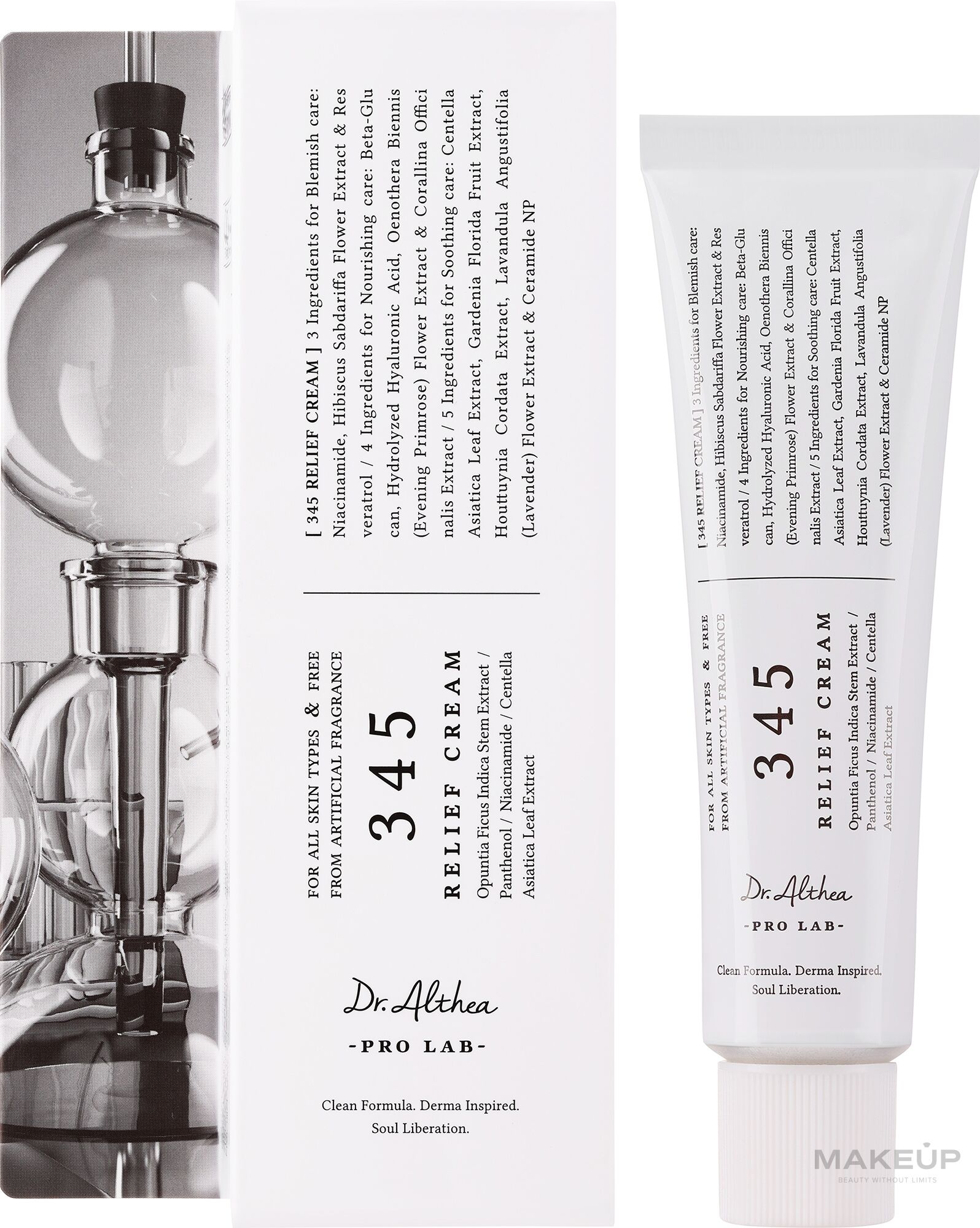 Dr. Althea 345 Relief Cream är en lugnande och återfuktande ansiktskräm från det koreanska hudvårdsmärket Dr. Althea. Krämen är utvecklad för känslig, irriterad och stressad hud och används som en daglig fuktkräm med fokus på att ge huden komfort och balans. Formuleringen hjälper till att minska känslan av irritation samtidigt som huden återfuktas och får ett mjukare, mer välmående utseende.