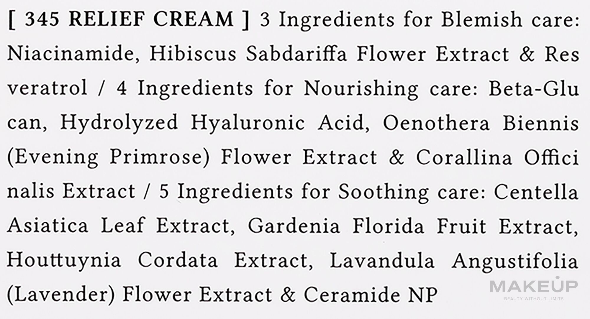 345 Relief Cream är en uppskattad produkt inom K-beauty tack vare sin skonsamma men effektiva sammansättning. Krämen har en behaglig konsistens som absorberas väl och lämnar huden återfuktad utan att kännas tung, vilket gör den lämplig för kontinuerlig användning även på hud som reagerar lätt på yttre påfrestningar.