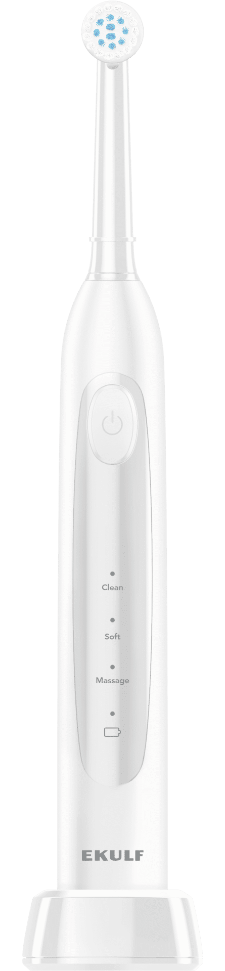 Eltandborsten har ett litet runt borsthuvud för att komma åt hela tanden. Borsthuvudet är utformat för att nå även svåråtkomliga områden mellan tänderna och avlägsnar plack effektivt. EKULF Oscillating PowerBrush erbjuder flera rengöringslägen för att passa dina individuella behov. Välj mellan CLEAN, SOFT och MASSAGE för en anpassad och skonsam rengöring. Med upp till 8800 borströrelser per minut genererar EKULF Oscillating PowerBrush kraftfull rengöring för friskare tänder.