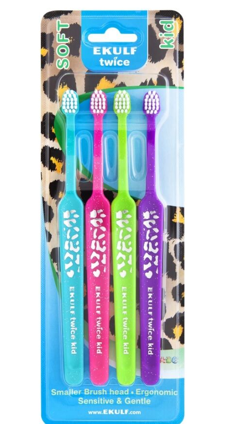 Den kompakt utformade borsten är rundad i toppen och består av mjuka borststrån. Borsthuvudet är betydligt mindre än på en vanlig tandborste. Ekulf Twice Kid har en böjd utformning som gör att den ligger stadigt i handen och man når lätt de bakre tänderna. 4-pack med tandborstar i färgerna turkos, rosa, grön och lila.