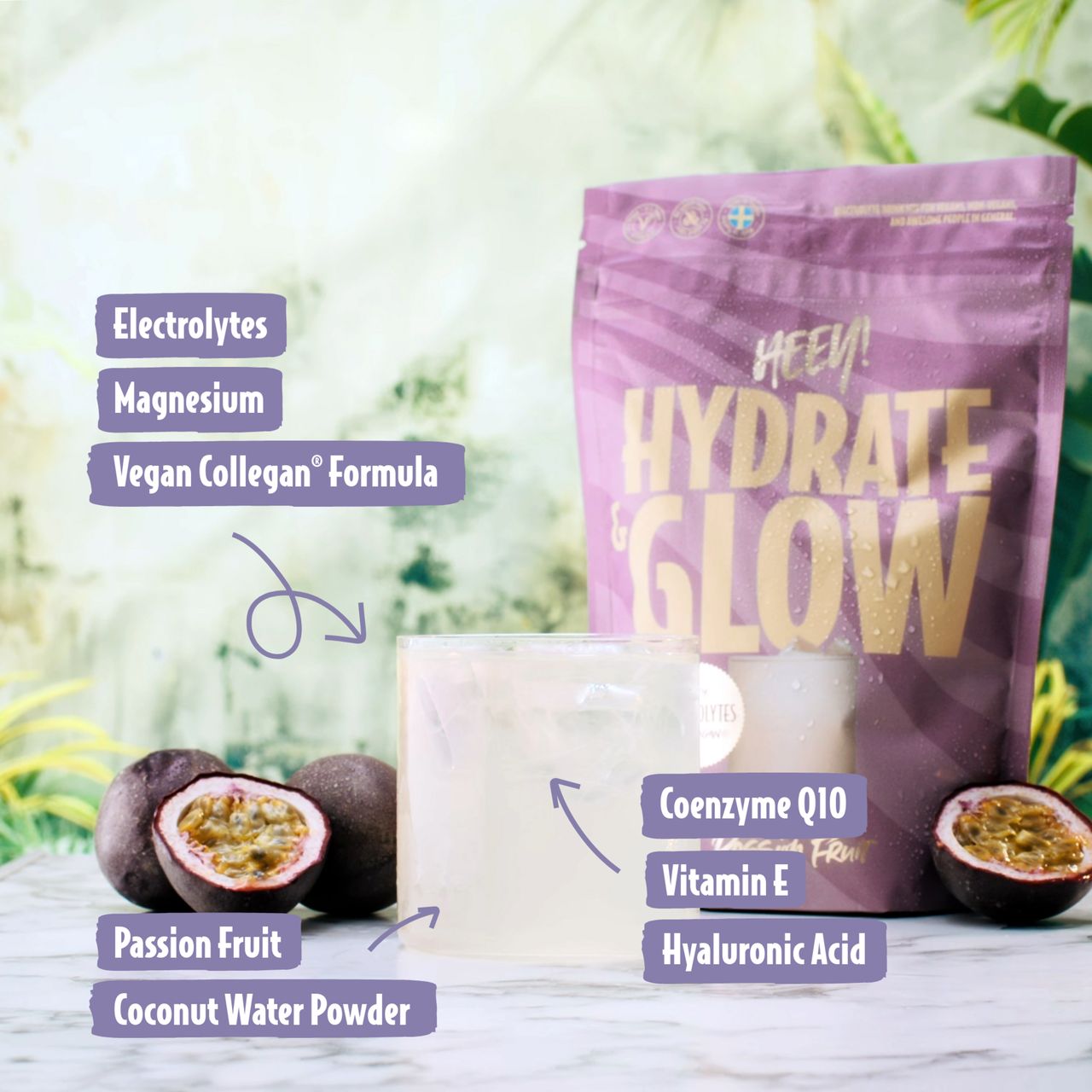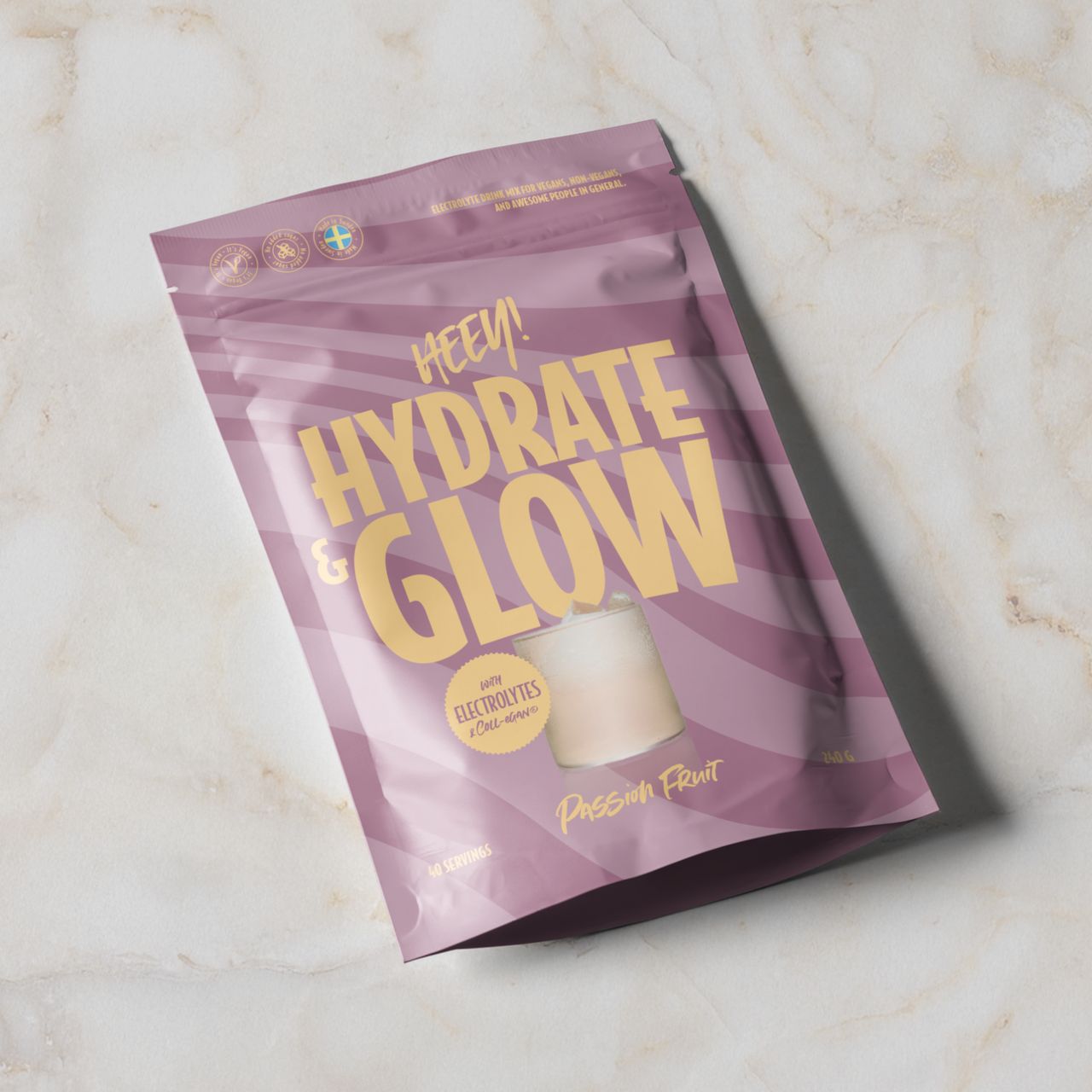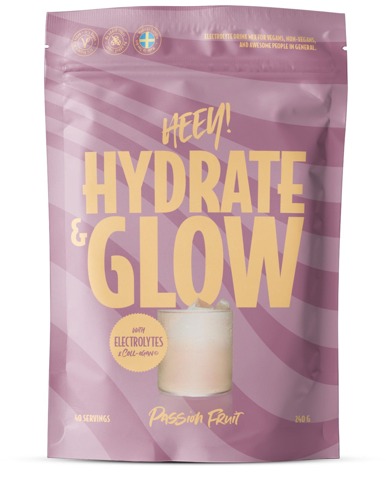 Elektrolyter + Coll-egan® Passionsfrukt 240 g är ett kosttillskott från Heey! med viktiga elektrolyter, salter och vitaminer. Även med Coll-egan®, veganskt kollagen.